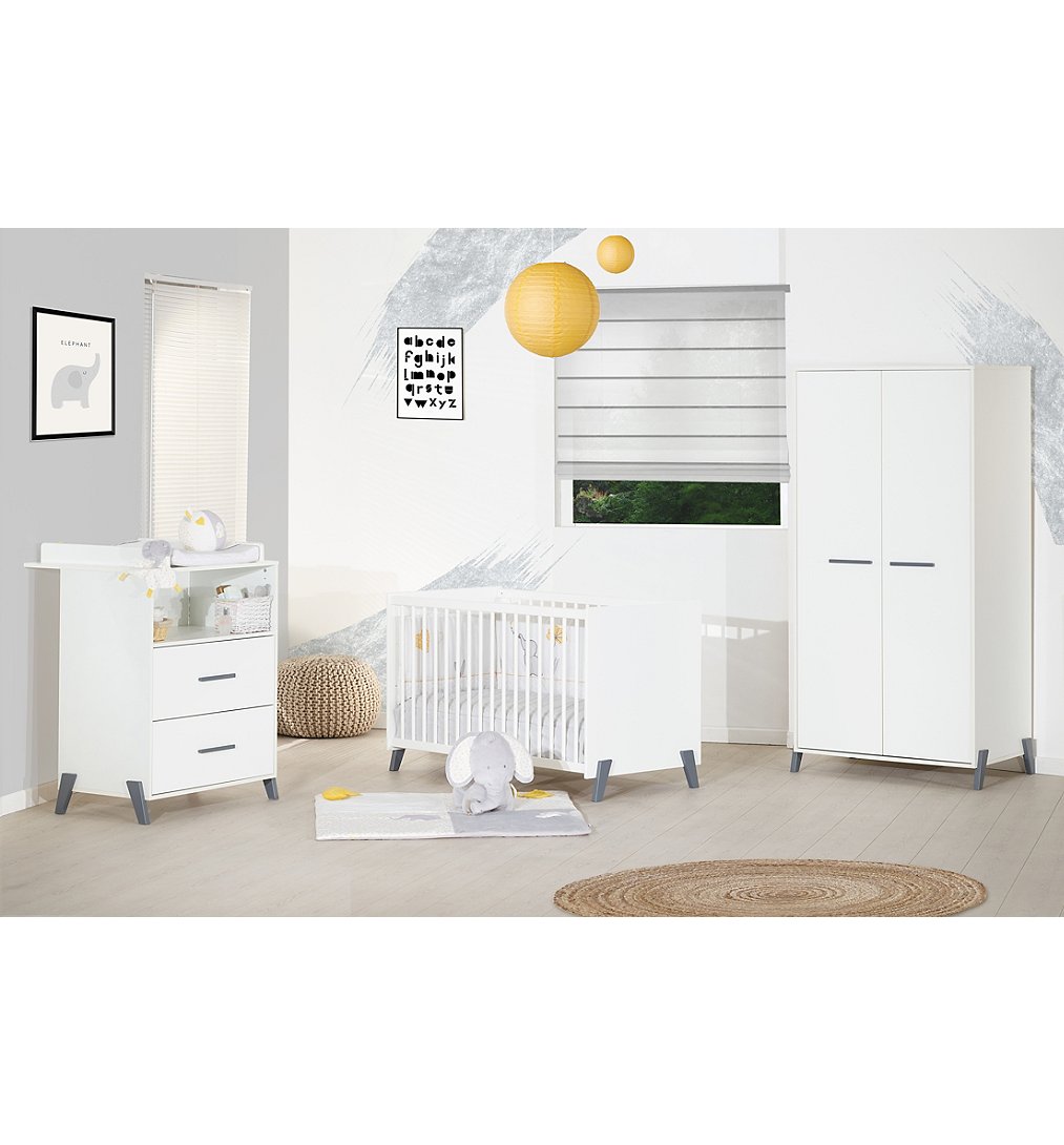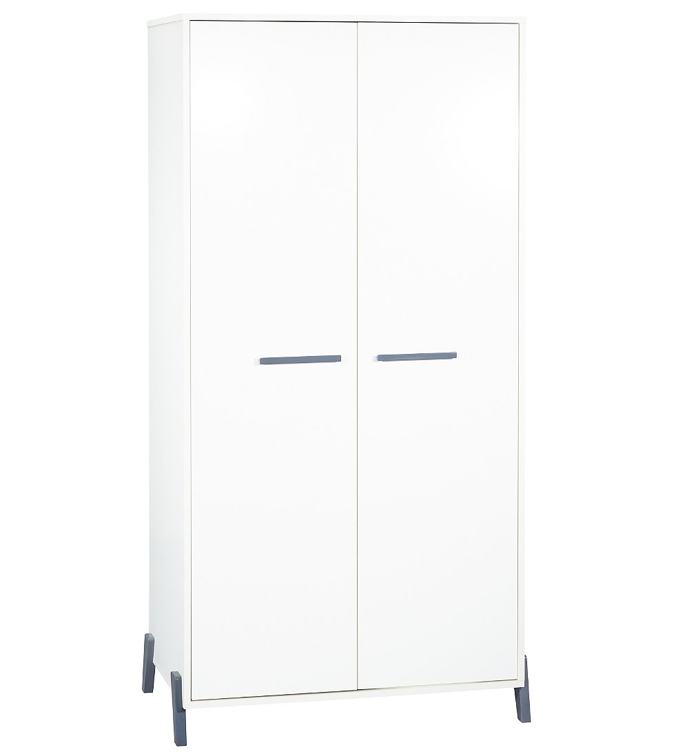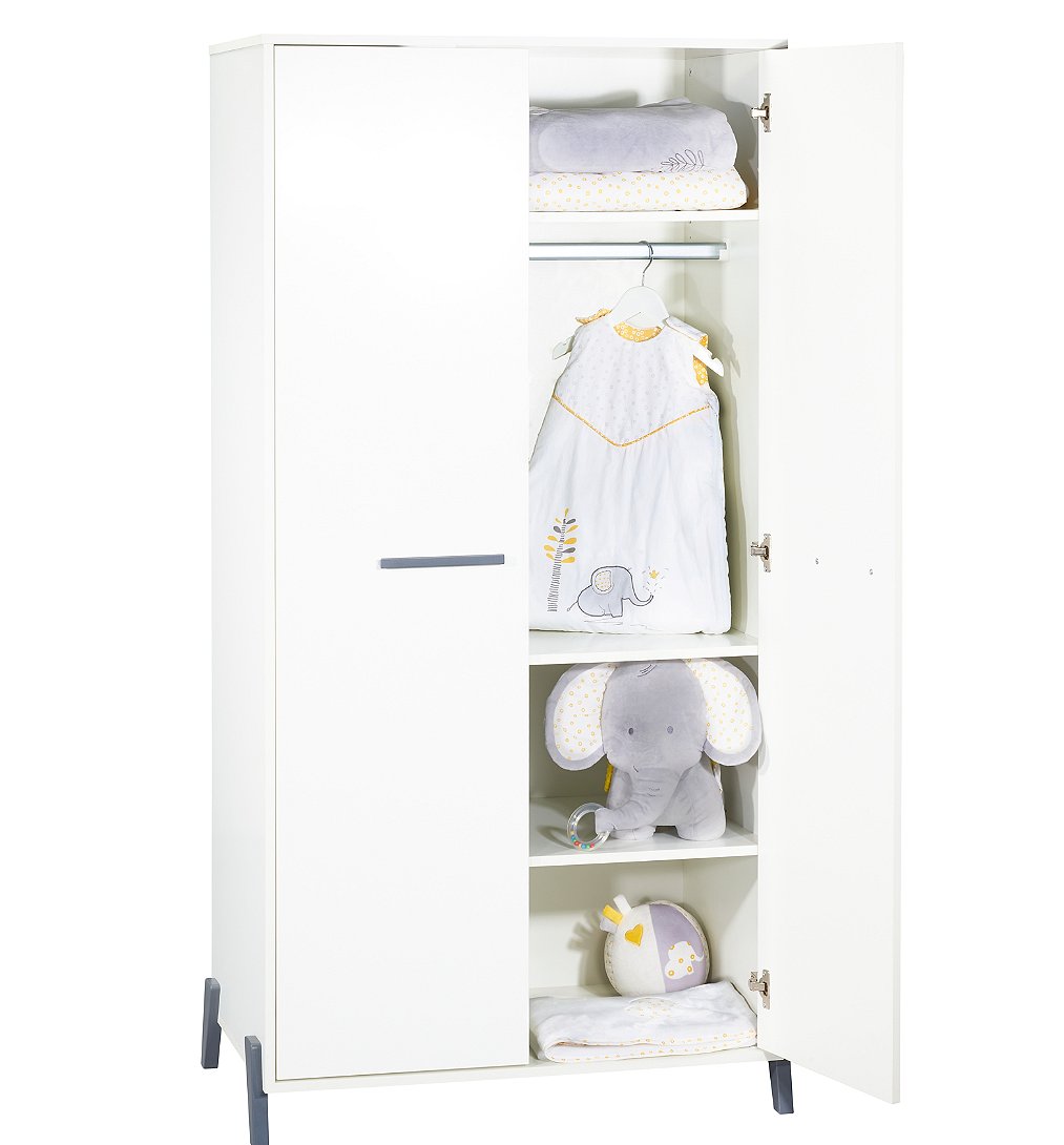 Armoire 2 portes avec pieds gris - JOY GRIS L'armoire de la collection Joy gris complétera harmonieusement la chambre de votre bébé. Simple, Elégante et moderne, elle vous offrira un beau volume de rangement grâce à ses 3 étagères et sa grande tringle penderie. Pour une chambre complète, vous pourrez associer à votre armoire, les lits 120x60 ou 140x70 et la commode 2 tiroirs JOY. Caractéristiques de l'armoire JOY: Dessus, dessous, cotés, 3 tablettes intérieures en panneaux de particules mélaminés décor blanc. Portes en panneaux de particules mélaminés décor blanc, laquées 1 face Blanc. 4 pieds et 2 poignées en hêtre laqués gris foncé. 1 grande tringle penderie Fabrication française Panneaux garantis avec une teneur en formaldéhyde de 4 mg/100g Garanti sans solvant Laque hydro_ Norme jouet 71/3 Dimensions de l'armoire JOY: 88x175x56 cm