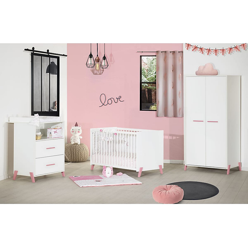 Armoire 2 portes avec pieds roses - JOY ROSE L'armoire de la collection Joy rose complétera harmonieusement la chambre de votre bébé. Simple, élégante et moderne, elle vous offrira un beau volume de rangement grâce à ses 3 étagères et sa grande tringle penderie. Pour une chambre complète, vous pourrez associer à votre armoire, les lits 120x60 ou 140x70 et la commode 2 tiroirs JOY. Caractéristiques de l'armoire JOY: Dessus, dessous, cotés, 3 tablettes intérieures en panneaux de particules mélaminés décor blanc. Portes en panneaux de particules mélaminés décor blanc, laquées 1 face Blanc. 4 pieds et 2 poignées en hêtre laqués rose poudré. 1 grande tringle penderie Fabrication française Panneaux garantis avec une teneur en formaldéhyde de 4 mg/100g Garanti sans solvant Laque hydro_ Norme jouet 71/3 Dimensions de l'armoire JOY: 88x175x56 cm