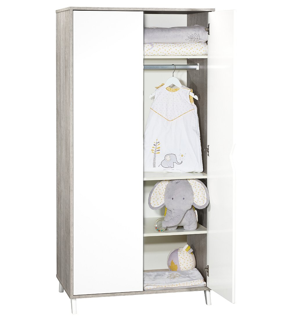 Armoire 2 portes - SCANDI GRIS Inspiré du design scandinave, cette armoire de la gamme Scandi gris viendra harmonieusement compléter la chambre de bébé. Derrière ses 2 portes se cachent 3 étagères et une grande tringle penderie pour ranger tout le nécessaire de bébé. Caractéristiques de l'armoire SCANDI: Dessus, dessous, et cotés, en panneaux de particules enrobés papier décor gris loft. 3 tablettes intérieures en panneaux de particules mélaminés décor blanc. Portes en panneaux de fibres de moyenne densité (MDF) laquées blanc. 4 pieds en hêtre laqués blanc. 1 grande tringle penderie Fabrication française Panneaux garantis avec une teneur en formaldéhyde de 4 mg/100g Garanti sans solvant Laque hydro_ Norme jouet 71/3 Dimensions de l'armoire SCANDI: 86x175x56 cm