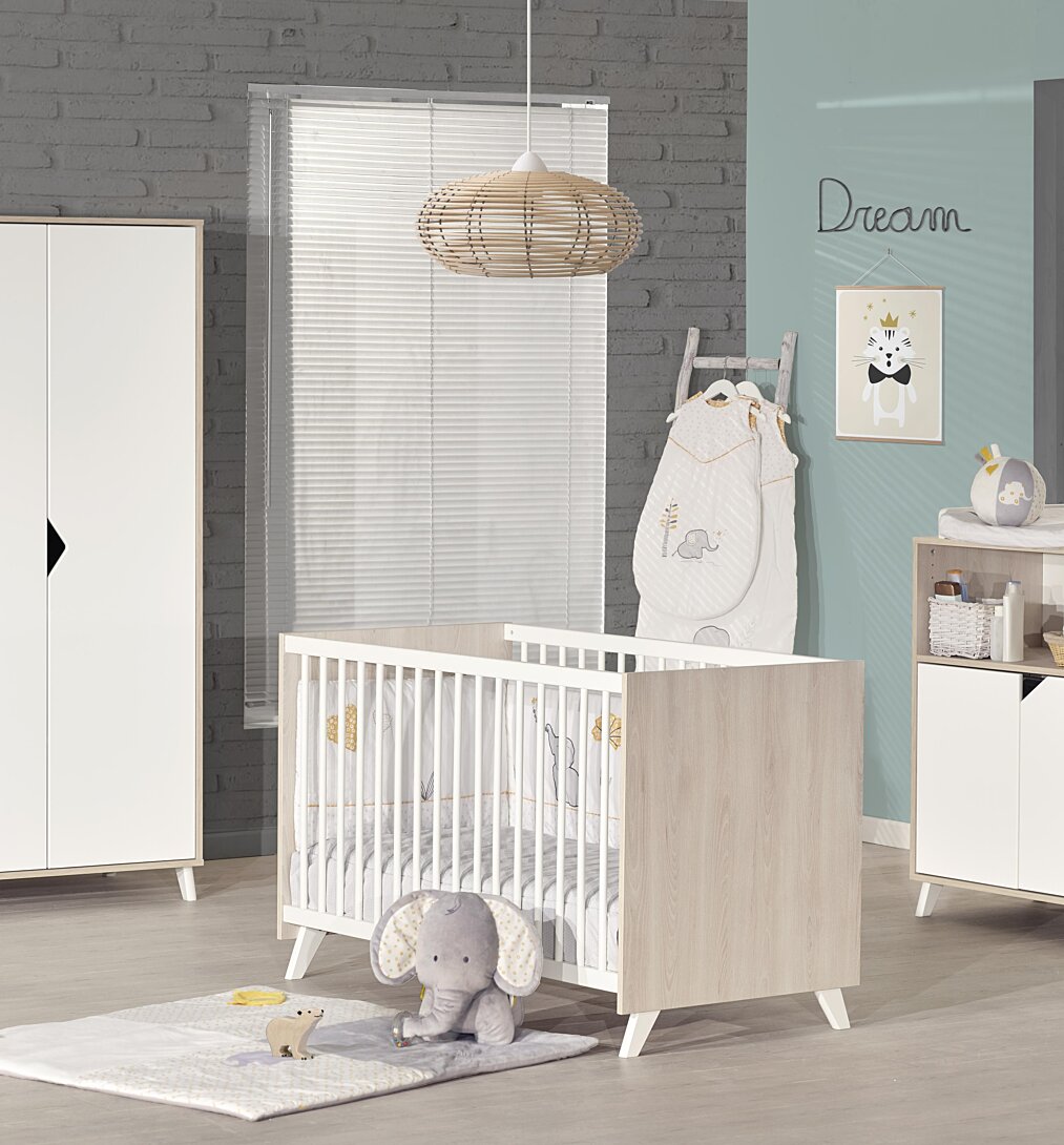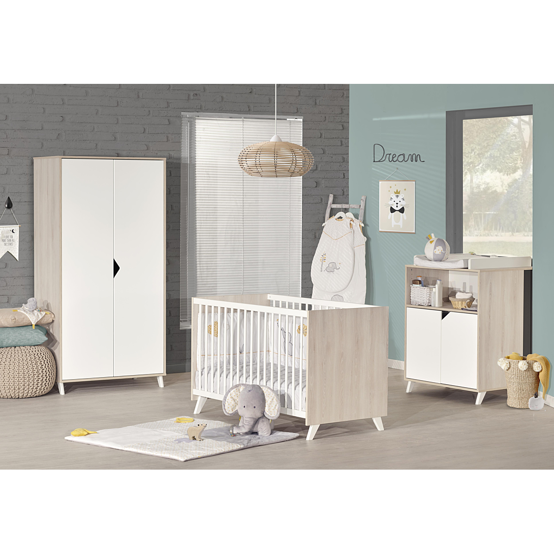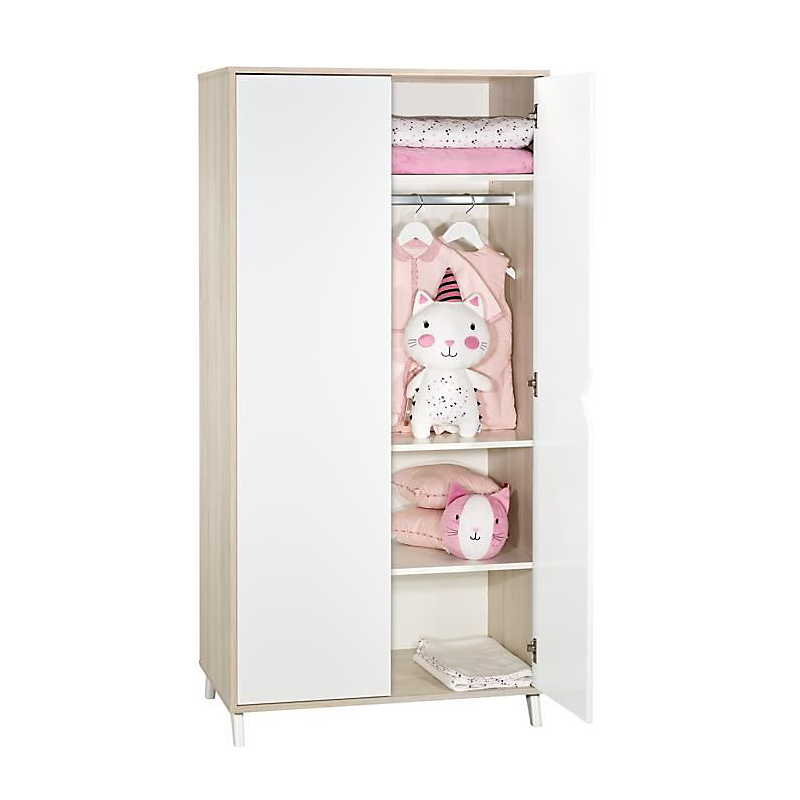 Armoire 2 portes - SCANDI NATUREL Inspiré du design scandinave, cette armoire de la gamme Scandi naturel viendra harmonieusement compléter la chambre de bébé. Derrière ses 2 portes se cachent 3 étagères et une grande tringle penderie pour ranger tout le nécessaire de bébé. Caractéristiques de l'armoire SCANDI: Dessus, dessous, et cotés, en panneaux de particules mélaminés décor hêtre cendré. 3 tablettes intérieures en panneaux de particules mélaminés décor blanc. Portes en panneaux de fibres de moyenne densité (MDF) laquées blanc. 4 pieds en hêtre laqués blanc. 1 grande tringle penderie. Fabrication française Panneaux garantis avec une teneur en formaldéhyde de 4 mg/100g Garanti sans solvant Laque hydro_ Norme jouet 71/3 Dimensions de l'armoire SCANDI: 86x175x56 cm
