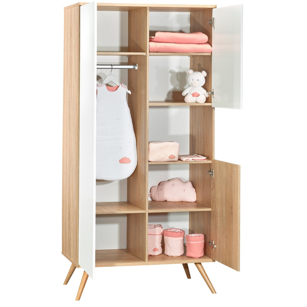 Cette grande armoire de la collection Seventies à tout pour plaire. Clin d'oeil aux meubles rétro, elle associe des décors blanc et bois et des pieds coniques inclinés pour parfaire son style vintage. Elle est dotée de 3 portes derrière lesquelles se cachent de grandes étagères et des penderies pour les vêtements et les accessoires de bébé. Pour une ouverture facilitée et sécurisée, les portes sont toutes équipées du système "pousse-lâche". La petite niche est idéale pour disposer des objets du quotidien ou de la jolie déco.