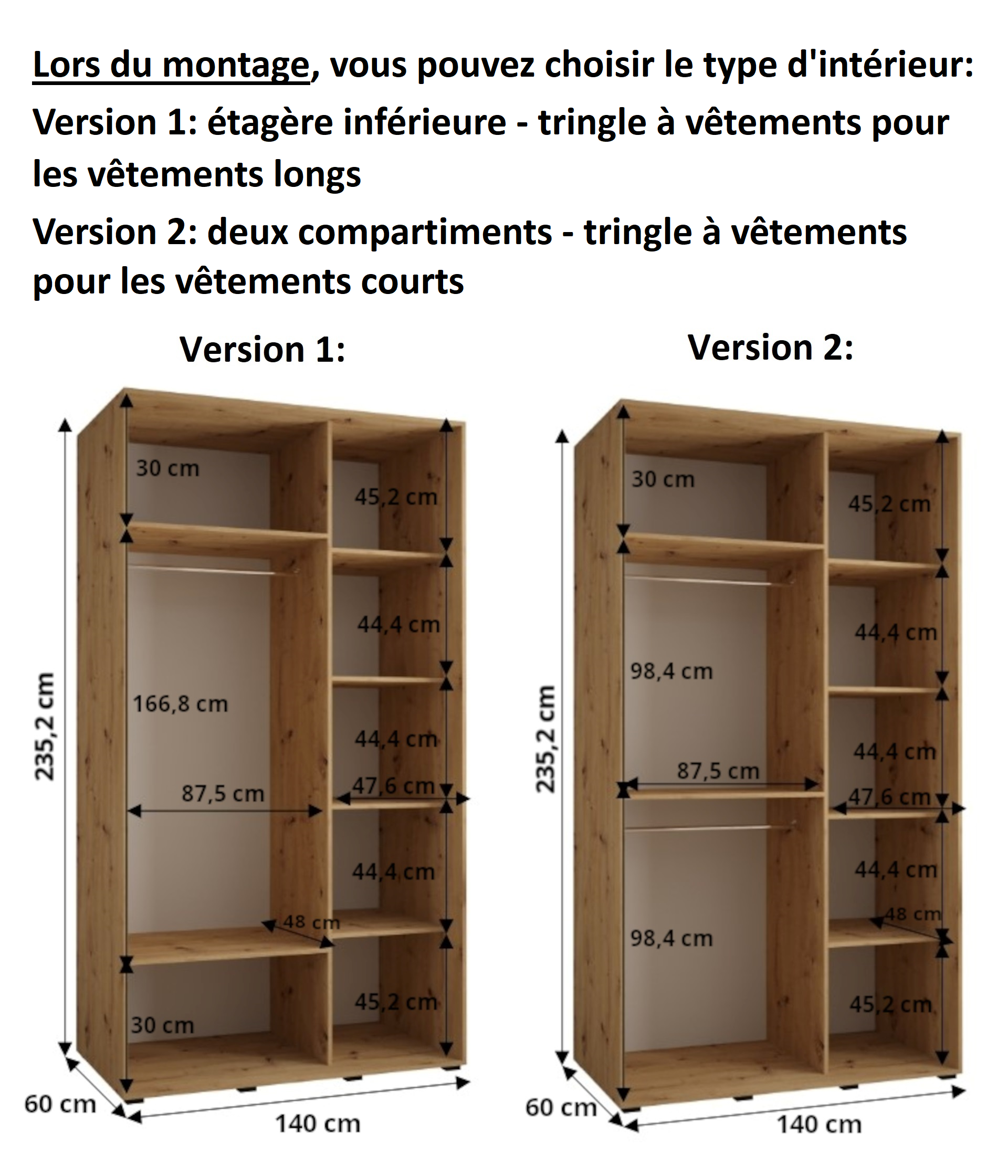 Dimensions : hauteur : 235,2 cm, largeur : 140 cm, profondeur : 60 cm. Dans le kit se trouvent les brosses anti-poussière. Choix du type d'intérieur lors de l'assemblage : version 1 - un compartiment long, une barre de suspension, version 2 - deux compartiments courts, deux barres de suspension.
