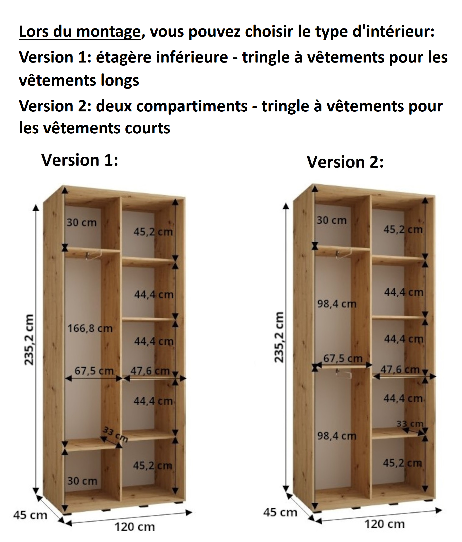 Dimensions : hauteur : 235,2 cm, largeur : 120 cm, profondeur : 45 cm. Dans le kit se trouvent les brosses anti-poussière. Choix du type d'intérieur lors de l'assemblage : version 1 - un compartiment long, une barre de suspension, version 2 - deux compartiments courts, deux barres de suspension.