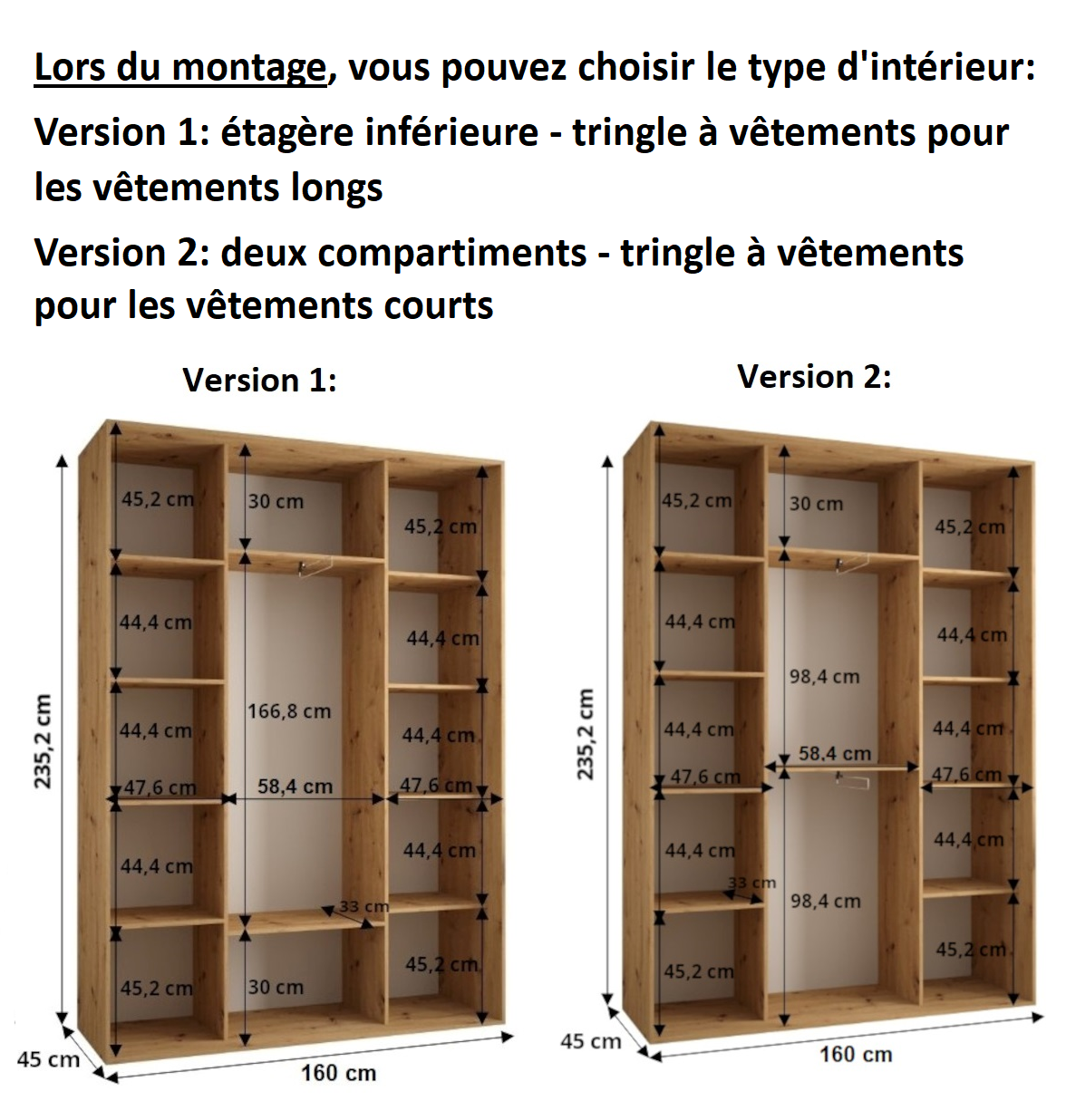 Dimensions : hauteur : 235,2 cm, largeur : 160 cm, profondeur : 45 cm. Dans le kit se trouvent les brosses anti-poussière. Choix du type d'intérieur lors de l'assemblage : version 1 - un compartiment long, une barre de suspension, version 2 - deux compartiments courts, deux barres de suspension.