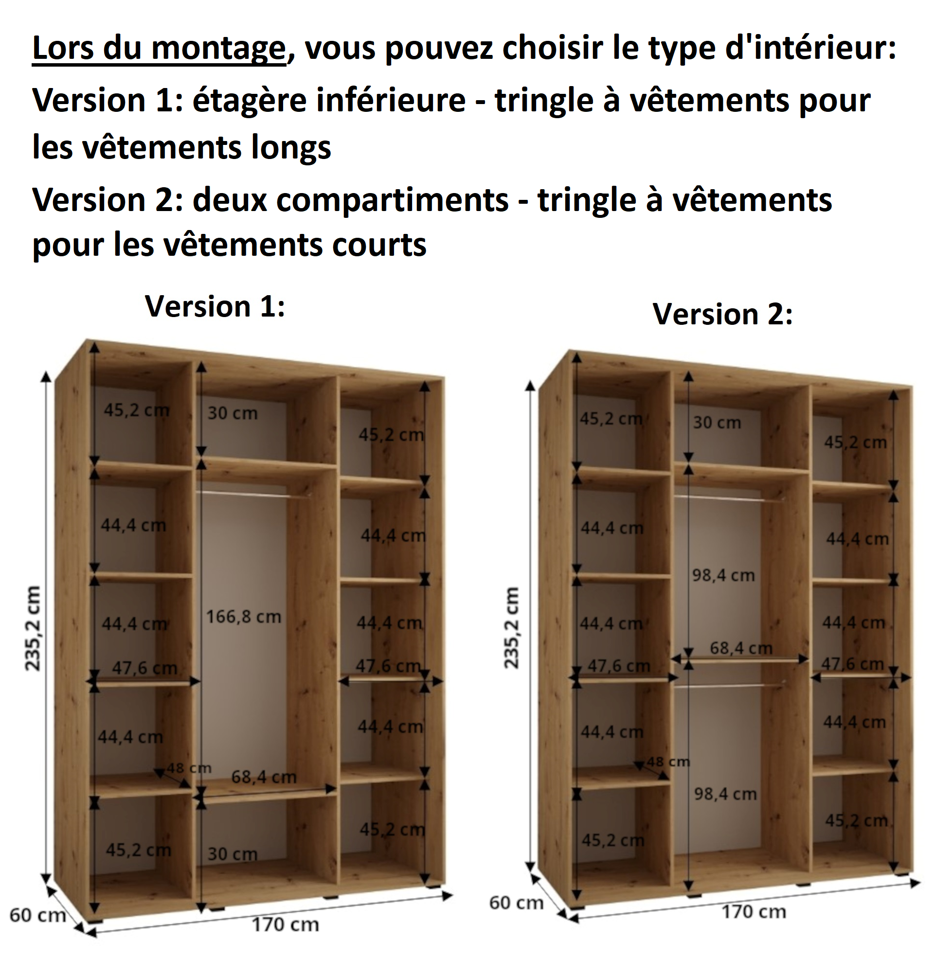 Dimensions : hauteur : 235,2 cm, largeur : 170 cm, profondeur : 60 cm. Dans le kit se trouvent les brosses anti-poussière. Choix du type d'intérieur lors de l'assemblage : version 1 - un compartiment long, une barre de suspension, version 2 - deux compartiments courts, deux barres de suspension.