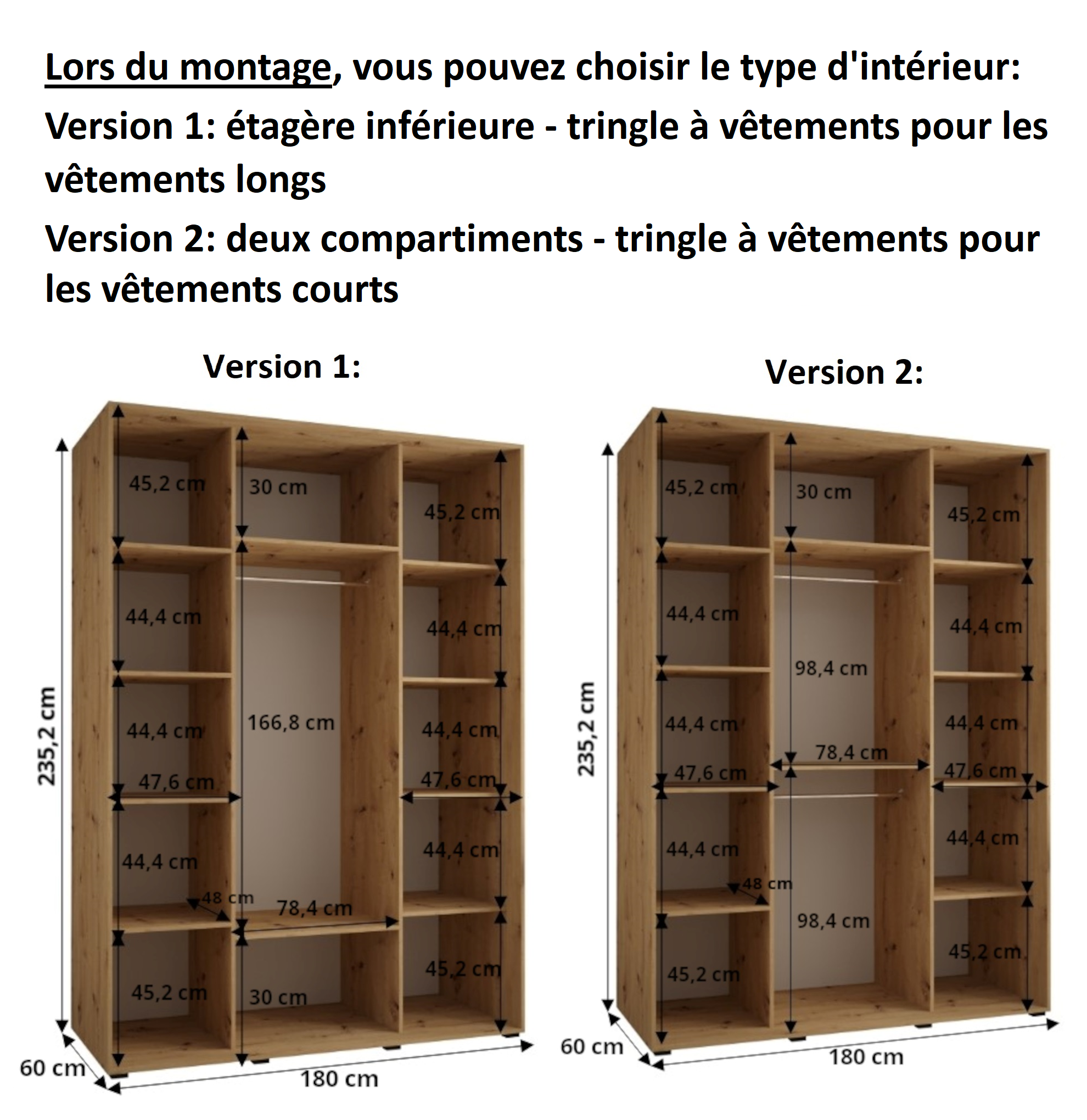 Dimensions : hauteur : 235,2 cm, largeur : 180 cm, profondeur : 60 cm. Dans le kit se trouvent les brosses anti-poussière. Choix du type d'intérieur lors de l'assemblage : version 1 - un compartiment long, une barre de suspension, version 2 - deux compartiments courts, deux barres de suspension.