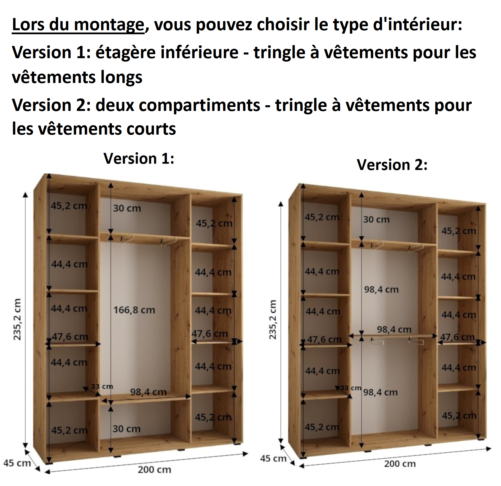Dimensions : hauteur : 235,2 cm, largeur : 200 cm, profondeur : 45 cm. Dans le kit se trouvent les brosses anti-poussière. Choix du type d'intérieur lors de l'assemblage : version 1 - un compartiment long, une barre de suspension, version 2 - deux compartiments courts, deux barres de suspension.