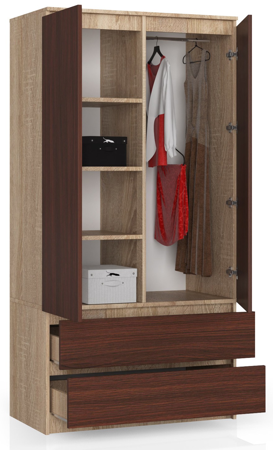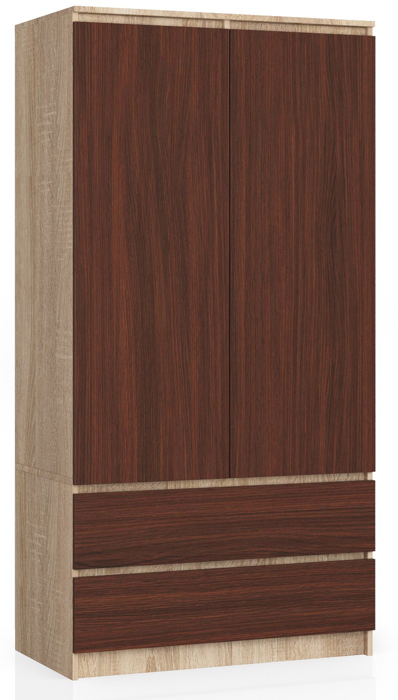 Armoire AKORD S90 Chêne Sonoma 90 cm 2 portes 2 tiroirs façade Wengé 4 étagères 90x51x180 cm