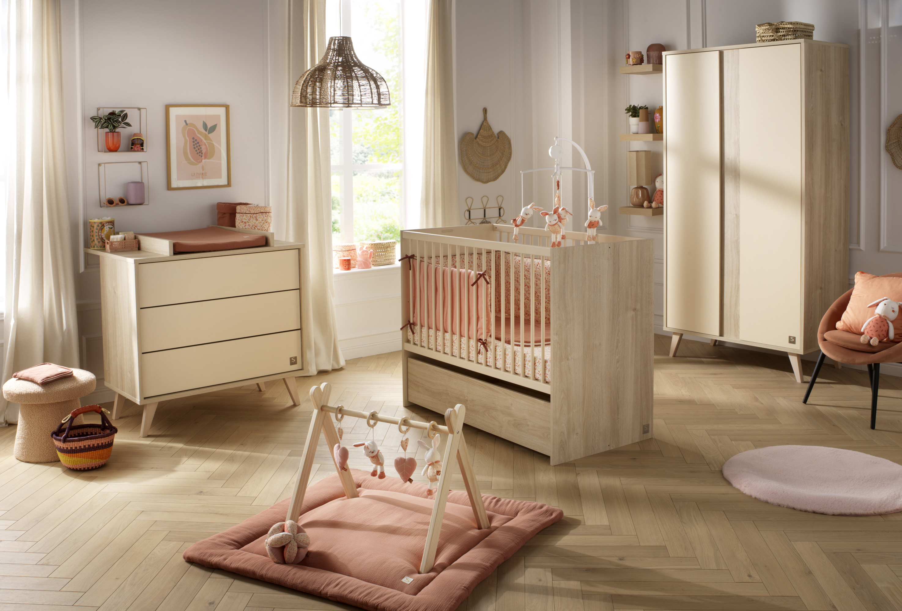 Plongez votre tout-petit dans un cocon de douceur et d'élégance avec la chambre Mélinée décor Chêne Sépia et beige. Cette collection, alliant le charme du bois et la sophistication des matières, offre un espace apaisant et raffiné. Conçue par Sauthon, l'armoire Mélinée apporte le charme intemporel du Chêne Sépia avec la modernité du beige, créant une atmosphère apaisante et raffinée.