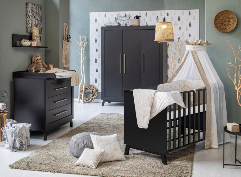 L'armoire Miami est fabriquée en bois MDF noir sur des pieds en hêtre massif pour une stabilité maximale. Sa structure est dotée de 3 portes s'ouvrant sur 2 larges étagères pour ranger harmonieusement les affaires de bébé.