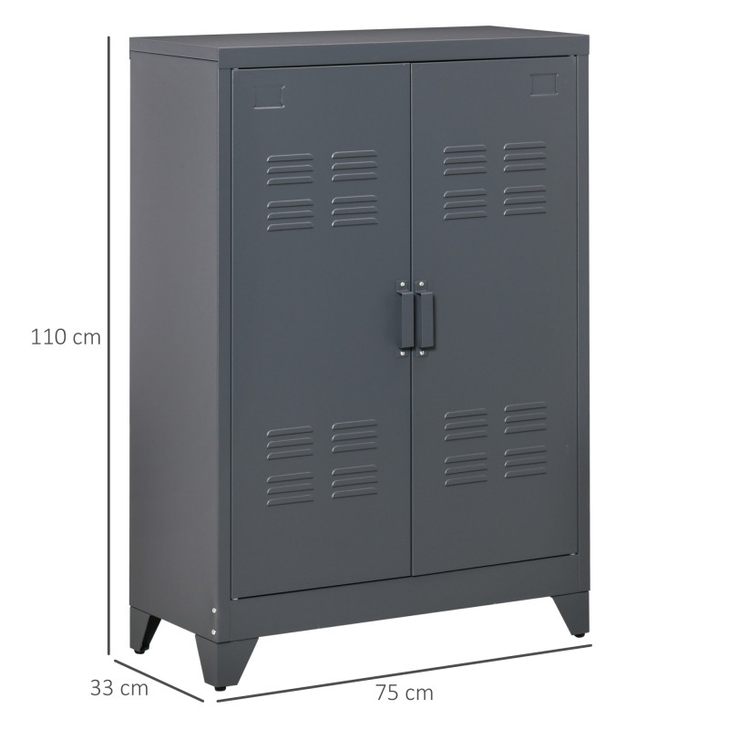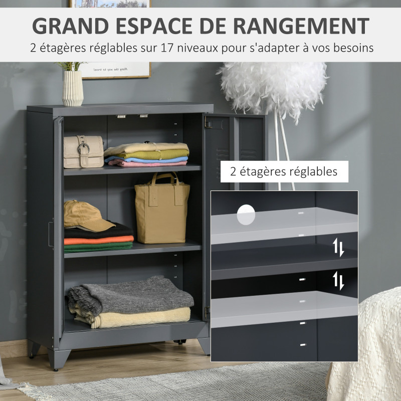Stylée et robuste, l'armoire Bergame de MYCOCOONING s'inscrit totalement dans le style déco industriel, toujours aussi tendance. Inspirée des vestiaires d'usine, cette armoire offre de beaux espaces de rangement et peut être également utilisée comme buffet. Ses 2 tablettes d'étagères peuvent être ajustées sur 17 différents niveaux de rangement et vous offrent l'opportunité de créer 3 espaces aux volumes aussi précis que vous le désirez. Cette armoire en métal présente des finitions soignées : les portes disposent de grilles d'aération et de poignées coudées ergonomiques. La fermeture se fait par l'intermédiaire de loqueteaux magnétiques et les pieds de nivellement permettent une stabilité absolue. Leurs patins antidérapants empêchent d'abîmer les sols et maintiennent ce joli meuble en métal bien en place. La charge maximale recommandée pour ce meuble est de 50 kilos. La tôle de métal de haute qualité qui le constitue garantit sa pérennité. Le montage est facile et rapide grâce au manuel illustré fourni. Caractéristiques : - Jolie petite armoire de rangement style industriel en métal coloris gris anthracite - Design et coloris intemporels qui conviendront à tous les styles de décorations - Meuble de rangement qui ajoutera une touche type factory à votre intérieur - 2 étagères réglables en hauteur soit 3 niveaux de rangement - Meuble polyvalent idéal pour installation dans la pièce de votre choix : salon, bureau, chambre, entrée, etc... - Excellent niveau de finition : portes dotées de petites grilles d'aération et poignées coudées (fermeture loqueteaux magnétiques), dispositif anti-basculement intégré, meuble sur pieds de nivellement antidérapants - Conception et fabrication de qualité en tôle de métal : solidité à l'épreuve du temps - Montage facile et rapide (manuel d'assemblage illustré fourni) Spécifications : - Couleur : gris anthracite - Matériau principal : tôle de métal - Dim. totales : 75L x 33l x 110H cm - Hauteur piètement: 7,7 cm - Charge max. recommandée : 50 Kg (au total), 10 Kg (par étagère) - Livraison effectuée en un colis
