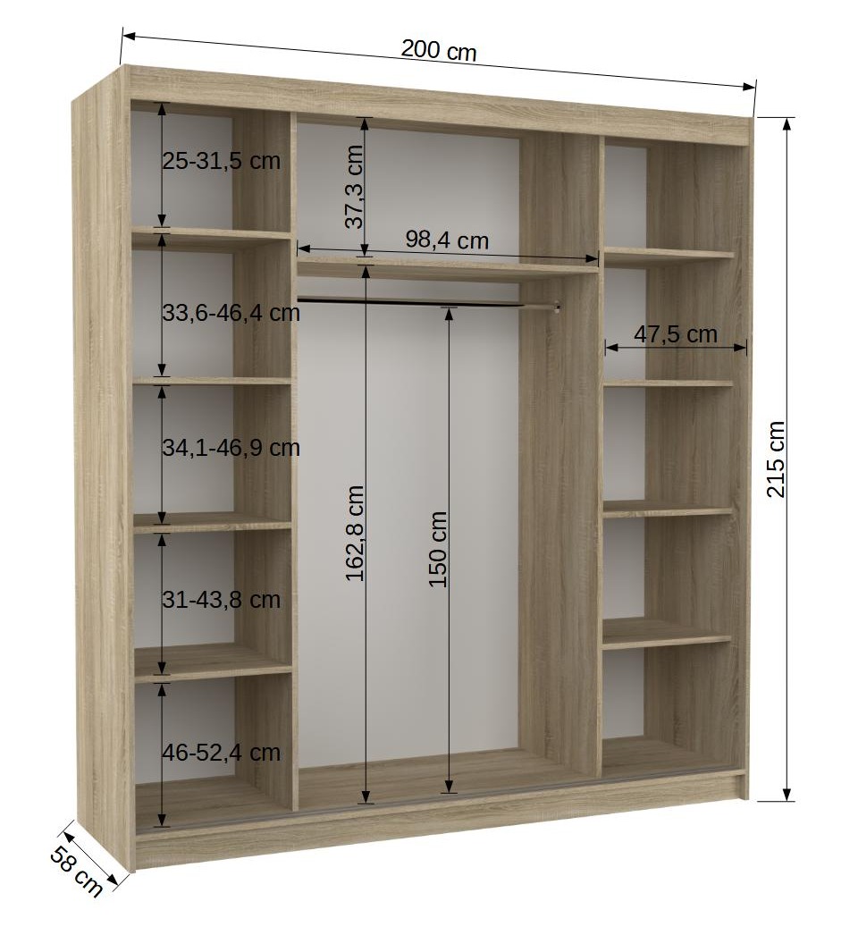 Découvrez notre superbe armoire de chambre à coucher pour adulte noir et bois artisan avec portes coulissantes et miroir, une solution idéale pour organiser votre espace avec style. Cette armoire est conçue pour répondre à vos besoins de rangement tout en apportant une esthétique unique à votre pièce. L'intérieur spacieux de l'armoire est équipé d'étagères généreuses, vous offrant amplement d'espace pour ranger vos robes, costumes, vêtements d'extérieur et chemises de manière organisée et accessible. De plus, un bar est prévu pour suspendre vos vêtements, les maintenant sans plis et prêts à être portés en toute occasion. Le devant de l'armoire est doté d'un miroir, ajoutant une touche de praticité tout en agrandissant visuellement votre espace. De plus, des rayures horizontales décoratives en argent confèrent à ce meuble un style unique et contemporain, faisant de lui un véritable élément de décoration dans votre chambre à coucher. Le système de portes coulissantes de cette armoire est un atout majeur, car il ne nécessite pas d'espace supplémentaire pour l'ouverture des portes. Cela en fait une solution parfaite pour les petites pièces ou les couloirs étroits, où chaque centimètre compte. En choisissant notre armoire de chambre à coucher avec portes coulissantes et miroir, vous optez pour un meuble de qualité supérieure avec un style unique. Fabriquée avec des matériaux durables, cette armoire est conçue pour résister à l'épreuve du temps tout en apportant une élégance raffinée à votre espace. Coloris : Noir et bois artisan Dimension :L 200 x H 215 x P 58 cm Façades : Bois artisan et miroir Nombre de portes : 2 coulissantes - Système d'enroulement Aménagement intérieur : Penderie et étagères réglables Poignées : Aluminium Poids : 151 Kg Corps : Panneau laminé de 16 mm blanc Casiers et étagères : panneau mélaminé 16 mm blanc Garantie : 5 ans Fabrication : Européenne Assemblage : A monter - Livrée avec notice de montage Nombre de colis : 3 1. 62x219x8,5 2. 63x201x7,5 3. 70x201x6 cm
