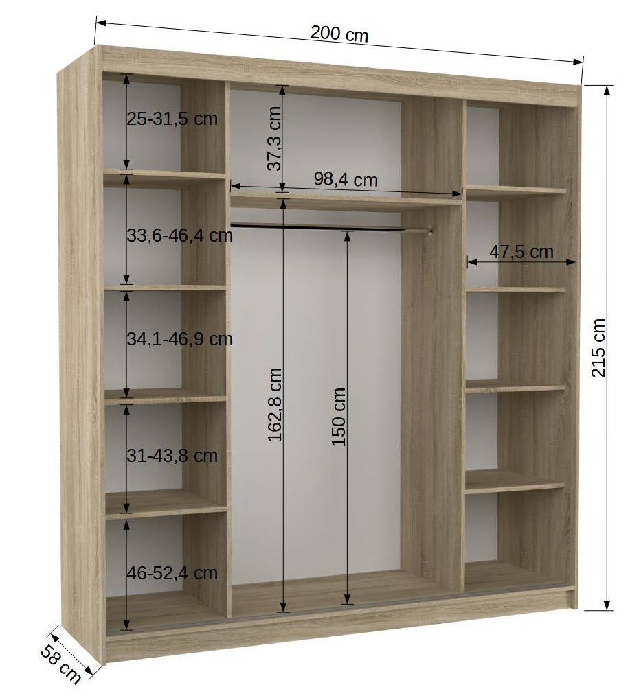 Découvrez notre magnifique armoire bois clair sonoma à 2 portes coulissantes Kamia, conçue pour vous offrir une solution de rangement optimale tout en ajoutant une touche de style à votre chambre à coucher. Cette armoire est spécialement conçue pour répondre à vos besoins d'organisation, offrant un espace généreux pour tous vos vêtements et accessoires. L'intérieur de l'armoire est équipé d'étagères spacieuses, vous permettant de ranger vos robes, costumes, vêtements d'extérieur et chemises de manière ordonnée et accessible. De plus, un espace est prévu pour suspendre vos vêtements, assurant qu'ils restent sans plis et prêts à être portés à tout moment. L'un des principaux avantages de cette armoire est son système de portes coulissantes. Vous n'avez donc pas besoin de prévoir un espace supplémentaire pour ouvrir les portes, ce qui en fait une solution idéale pour les petites pièces ou les couloirs étroits. Vous pouvez ainsi maximiser votre espace sans compromettre l'accès à vos affaires. L'armoire Kamia est non seulement pratique, mais elle ajoute également une touche d'élégance à votre chambre à coucher avec sa finition blanche épurée. Son design intemporel s'harmonise facilement avec différents styles de décoration, vous permettant de créer un espace à la fois fonctionnel et esthétique. Fabriquée avec des matériaux de qualité, cette armoire est conçue pour durer. Elle résiste aux rigueurs de l'utilisation quotidienne, garantissant ainsi que vos vêtements et accessoires seront bien protégés. Ne manquez pas l'opportunité d'optimiser votre espace de rangement avec style. Commandez dès maintenant notre armoire à 2 portes coulissantes Kamia et profitez d'une solution pratique et élégante pour organiser votre chambre à coucher, quelle que soit sa taille. Coloris : Bois clair sonoma Dimension :L 200 x H 215 x P 58 cm Façades : Bois clair sonoma Nombre de portes : 2 coulissantes - Système d'enroulement Aménagement intérieur : Penderie et étagères réglables Poignées : Aluminium Poids : 143 Kg Corps : Panneau laminé de 16 mm bois clair sonoma Casiers et étagères : panneau mélaminé 16 mm bois clair sonoma Garantie : 5 ans Fabrication : Européenne Assemblage : A monter - Livrée avec notice de montage Nombre de colis : 3 1. 62x219x8,5 2. 63x201x7,5 3. 70x201x6 cm