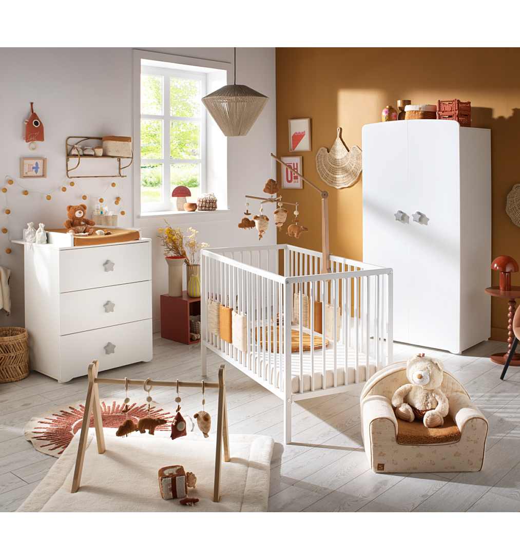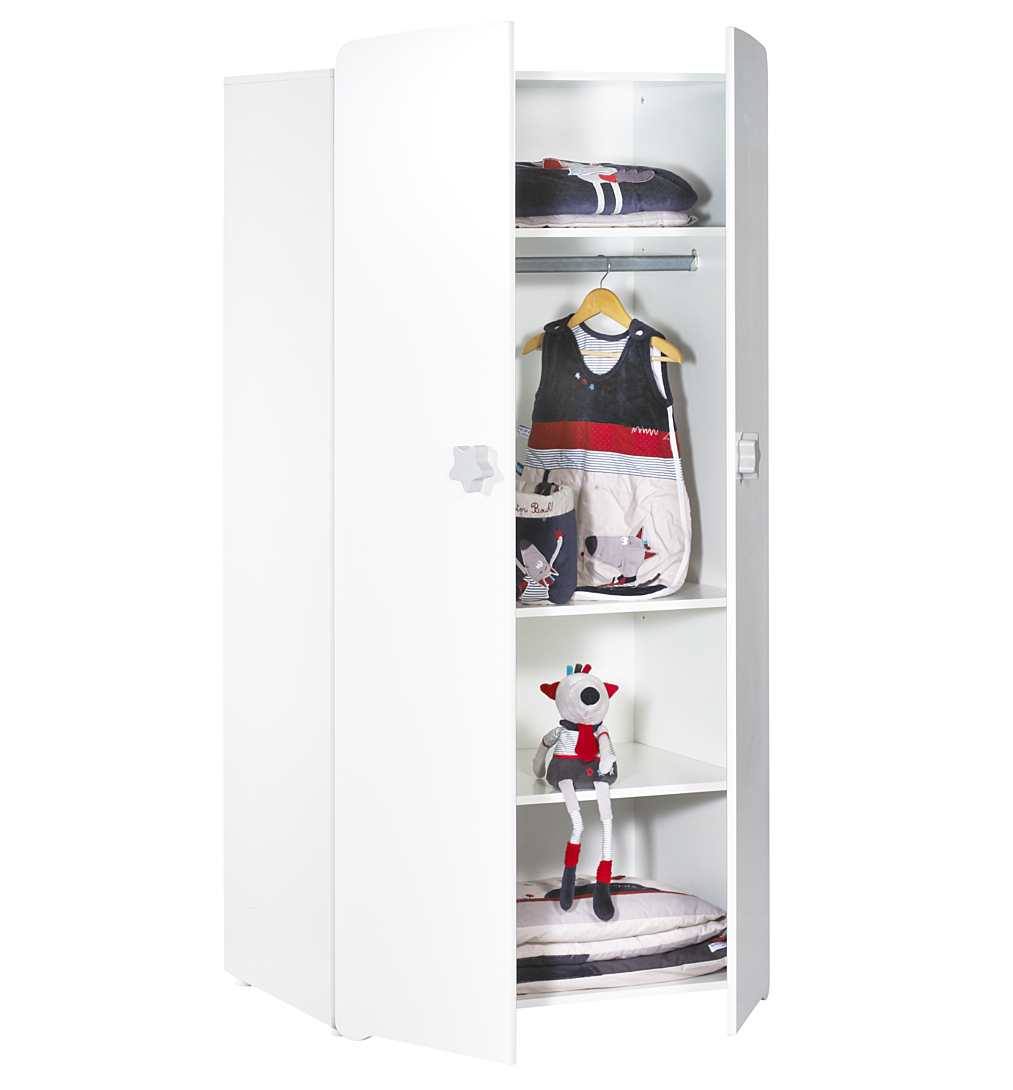 Armoire chambre bébé 2 portes - Boutons étoile gris NEW BASIC Armoire 2 portes boutons "étoile" gris fumé Une collection mixte essentielle pour l'arrivée de bébé laquée, blanc et agrémentée de boutons "étoile" gris fumé. Aménagement intérieur : 3 tablettes mobiles. Penderie. Assortie aux lits 1P032, 1P035, 1P037 & 1P113 et à la commode 3 tiroirs référence 1P164. Garantie sans solvant. Panneaux garantis avec une teneur en formaldéhydes <=8 mg. Fabrication française. Dimensions: 85 x 175 x 56 Composition: Panneau de fibres de moyenne densité (MDF) laqué blanc / Panneaux de particules mélaminé blanc / Boutons "étoile" gris fumé en MDF. Conseils d'entretien Dépoussiérage chiffon sec : ni alcool, ni solvant. Tâches rebelles : éponge légèrement humide. Meuble à monter soi-même