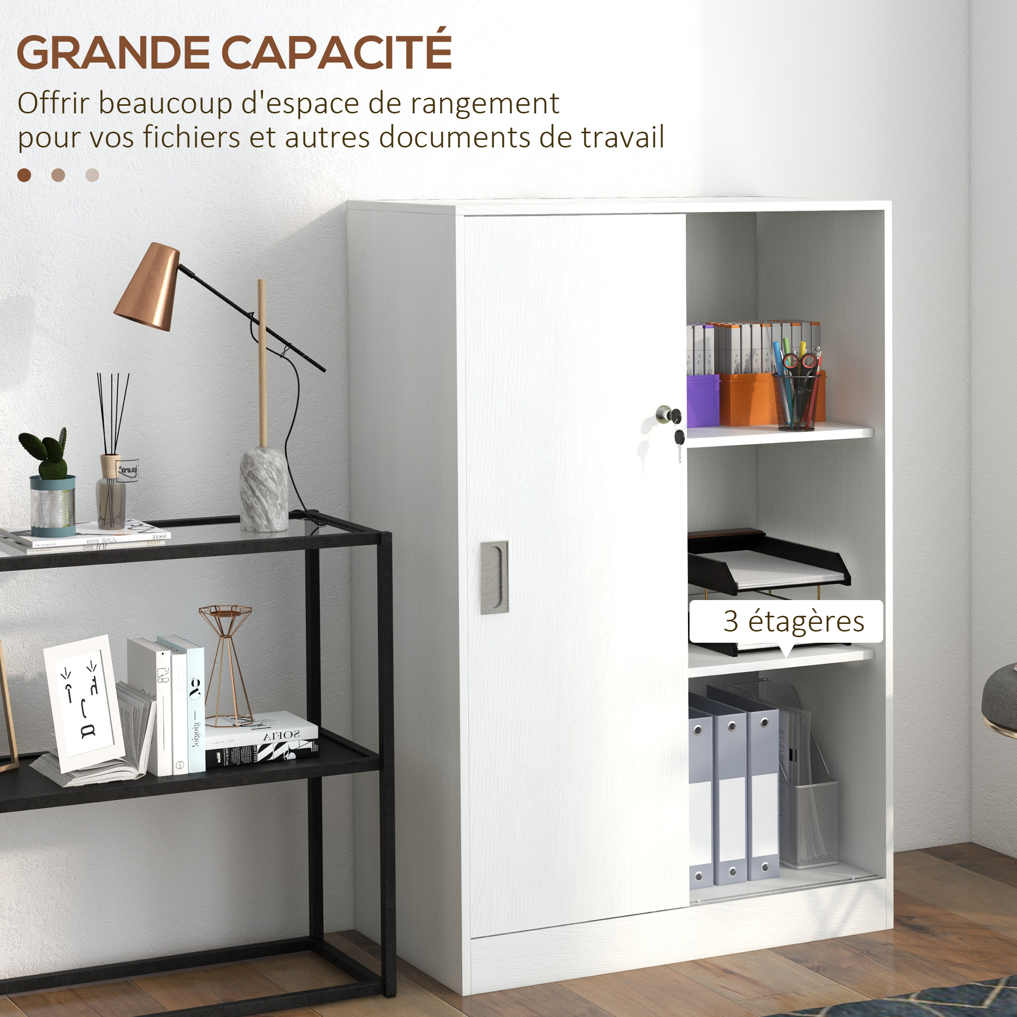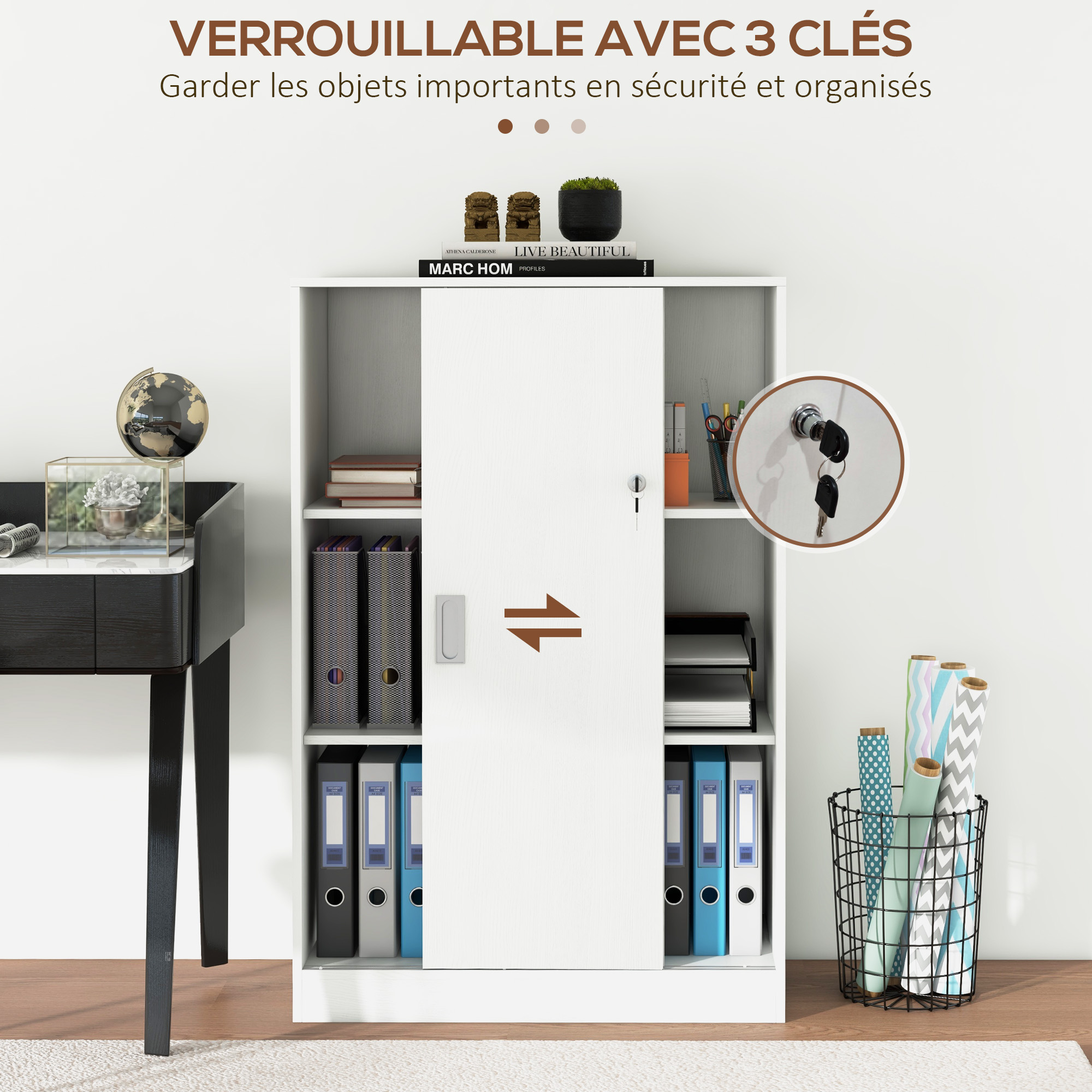 - Armoire sécurisée double portes coulissantes verrouillables (2 clés fournies) : idéale pour le rangement de vos dossiers, documents, et autres affaires de bureau