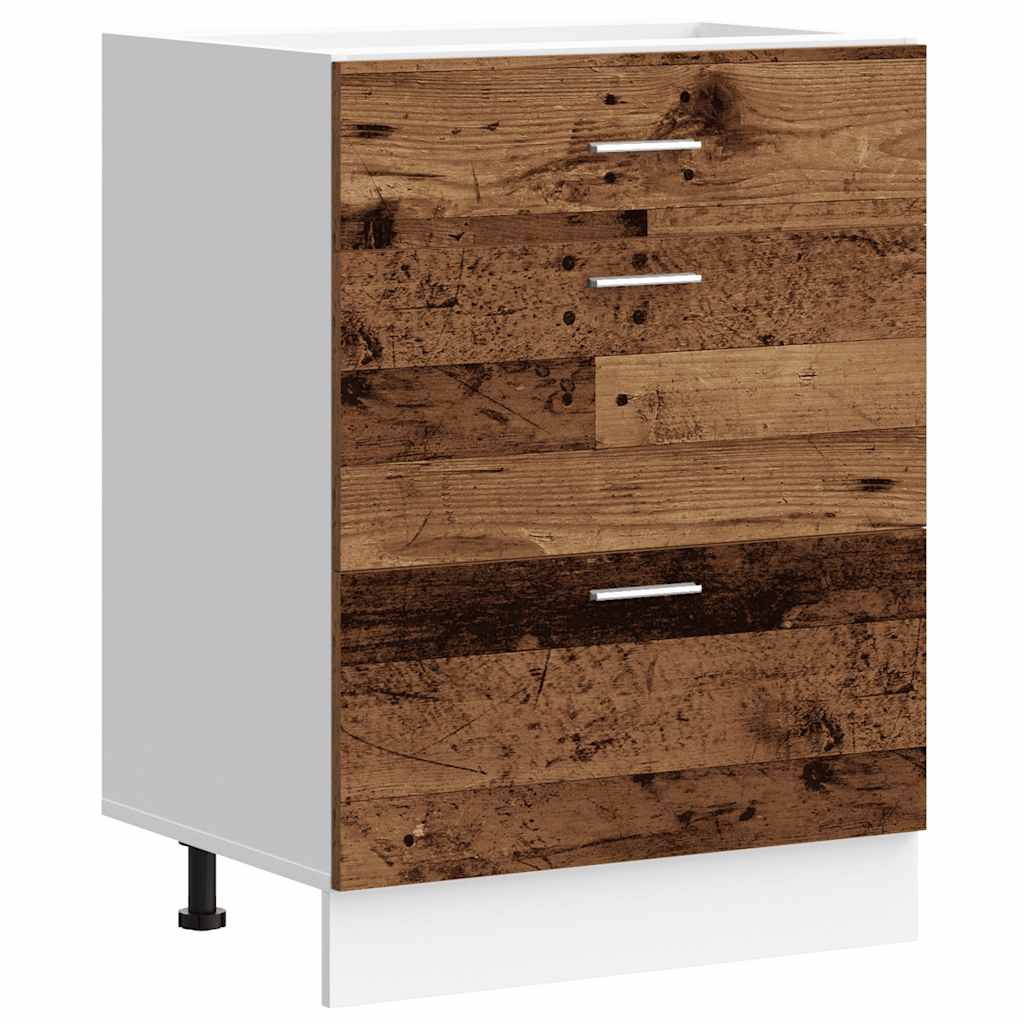 Cette armoire de cuisine optimise votre espace de cuisine, offrant un espace de rangement suffisant pour vos effets personnels ! Matériau stable et durable : le bois d'ingénierie est un matériau durable et stable dont la surface lisse résiste à l'humidité, à la déformation et au fendillement, ce qui en fait un choix fiable pour une grande variété de projets.Grand espace de rangement : l'armoire de cuisine offre suffisamment d'espace pour ranger des bols, des assiettes, des casseroles et d'autres appareils de cuisine.Pieds réglables : les pieds de cette armoire être réglés en hauteur pour s'adapter à la configuration de votre cuisine.Facile à entretenir : grâce à sa surface lisse, cette armoire de cuisine se nettoie facilement à l'aide d'un chiffon humide et nécessite peu d'entretien. Attention :Pour éviter qu'il ne bascule, ce produit doit être utilisé avec le dispositif de fixation murale fourni. Bon à savoir :Les vis et les chevilles pour l'intérieur du mur ne sont pas incluses. Recherchez et utilisez des vis et des chevilles adaptées à vos murs. Si vous n'êtes pas sûr, demandez conseil à un professionnel. Lisez et suivez attentivement chaque étape des instructions. Couleur : vieux bois Matériau : bois d'ingénierie Dimensions totales : 60 x 46 x 81,5 cm (l x P x H) Dimensions de chaque tiroir : 60 x 38,5 x 16/27 cm (l x P x H) Capacité maximale de poids : 50 kg Capacité de poids par tiroir : 5-8 kg Avec pieds réglables Assemblage requis : oui