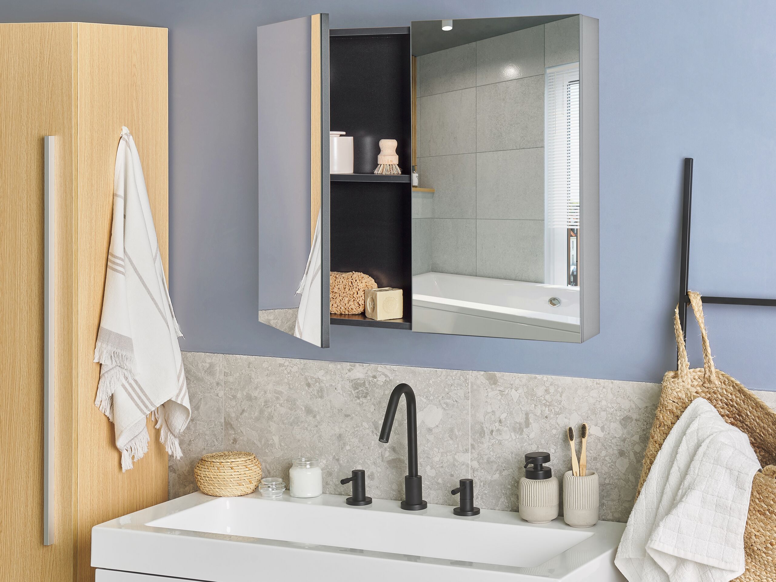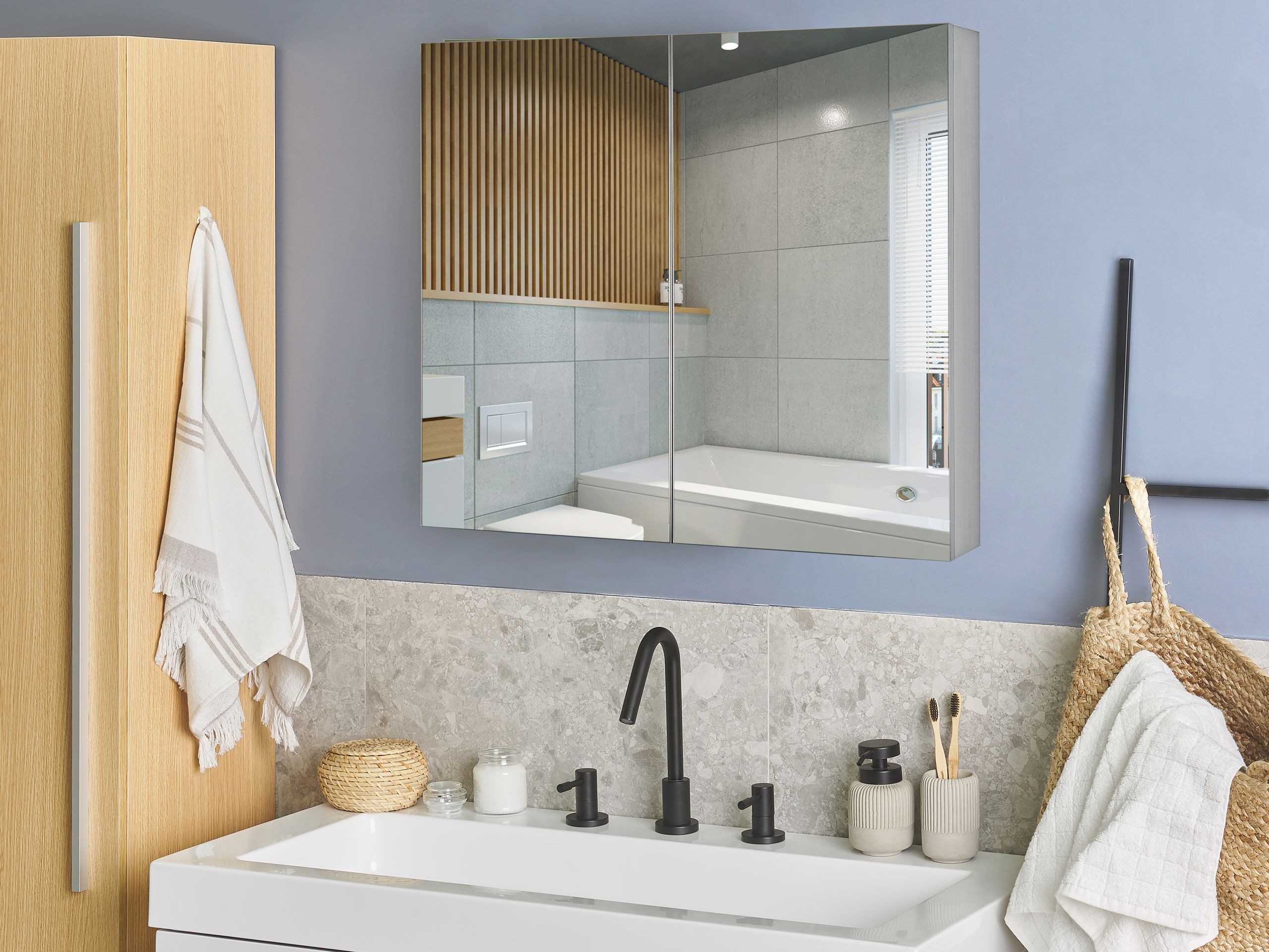 Armoire à miroir de salle de bain élégante. Grâce à son design simple, sans poignée, cette armoire s'adapte à de nombreux concepts d'aménagement intérieur. Derrière les portes à miroir, il y a suffisamment d'espace pour les accessoires de salle de bains. Le mécanisme de fermeture en douceur de la porte offre un confort supplémentaire. L'armoire de toilette murale est particulièrement utile dans les petites salles de bains, car elle agrandit visuellement l'espace.