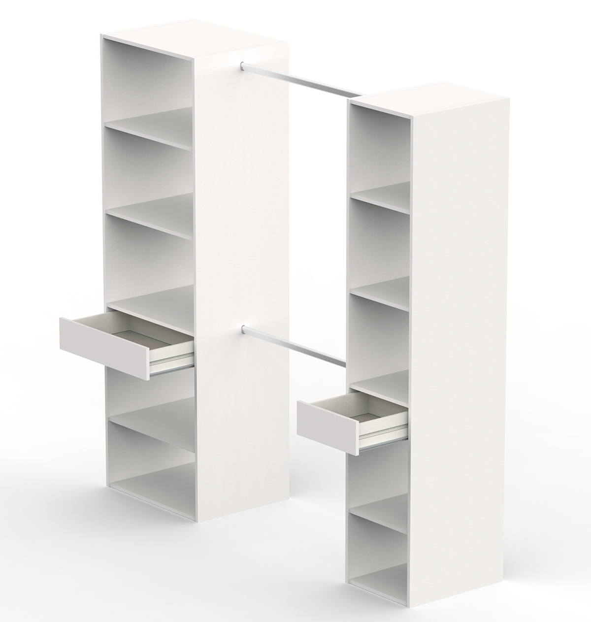 Armoire kit dressing, en panneaux de particules et mélamine haute densité coloris blanc, composée de 2 penderies et de 2 colonnes avec chacune 1 tiroir (guides métalliques) et 4 étagères dont 1 réglable en hauteur (la plus basse). Comprend la quincaillerie pour fixer au mur. Produit de fabrication Espagnol certifié PEFC. Livré en kit. Dimensions : Hauteur 200 x Longueur 200 x Profondeur 50 cm Longueur étagère : 65 cm. Étagère étroite : 39,5 cm Hauteur des étagères supérieures : 36,5 cm Hauteur totale des compartiments inférieurs : 66,5 cm Matière : panneaux de particules et mélamine haute densité Coloris : Blanc Poids : 85 kg