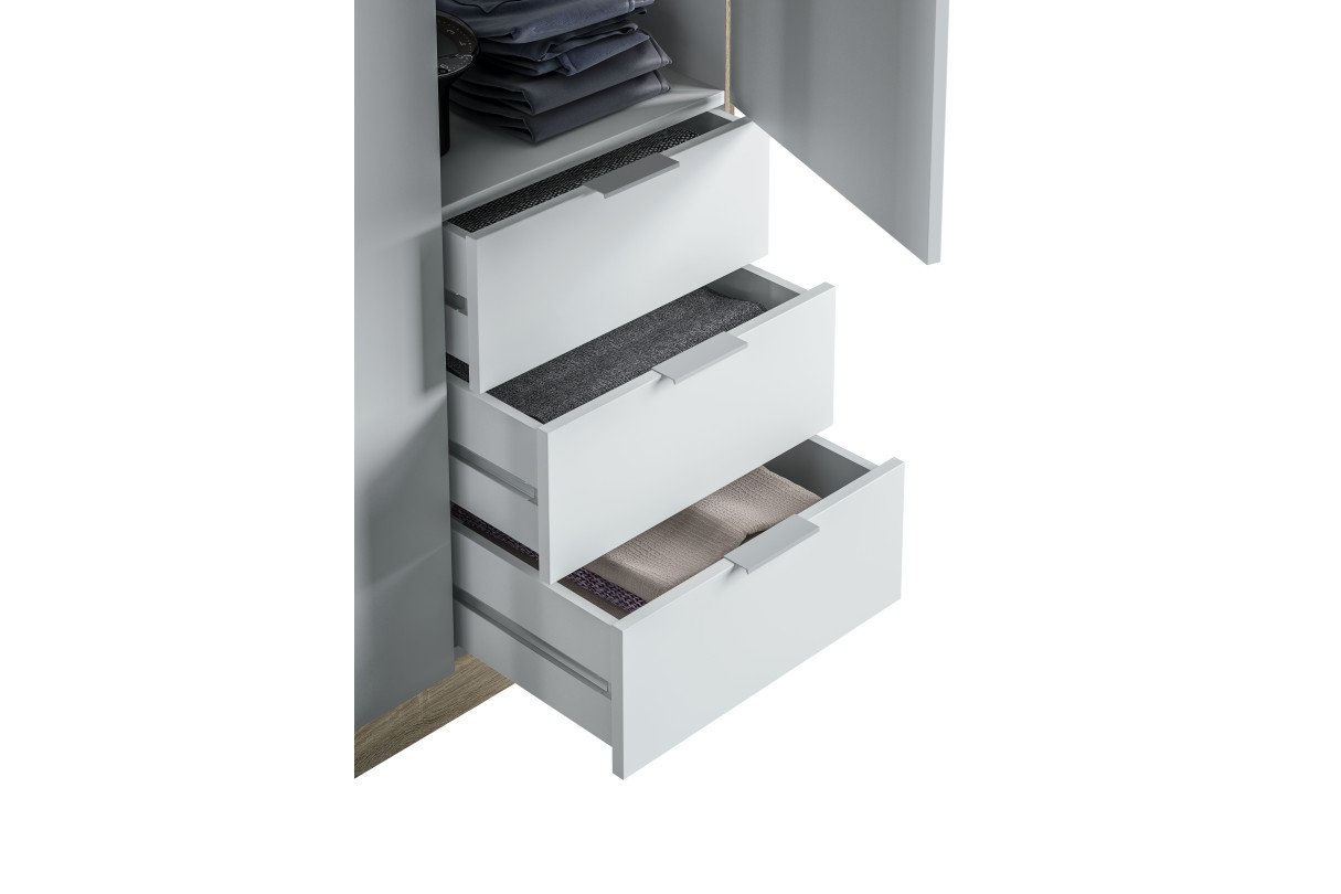 Dotée dune penderie amovible, de trois étagères et de trois tiroirs, l'armoire NINA vous offre de nombreux espaces de rangement. Elle vous permettra de ranger et trier vos linges de maison, vos vêtements et autres accessoires vestimentaires.