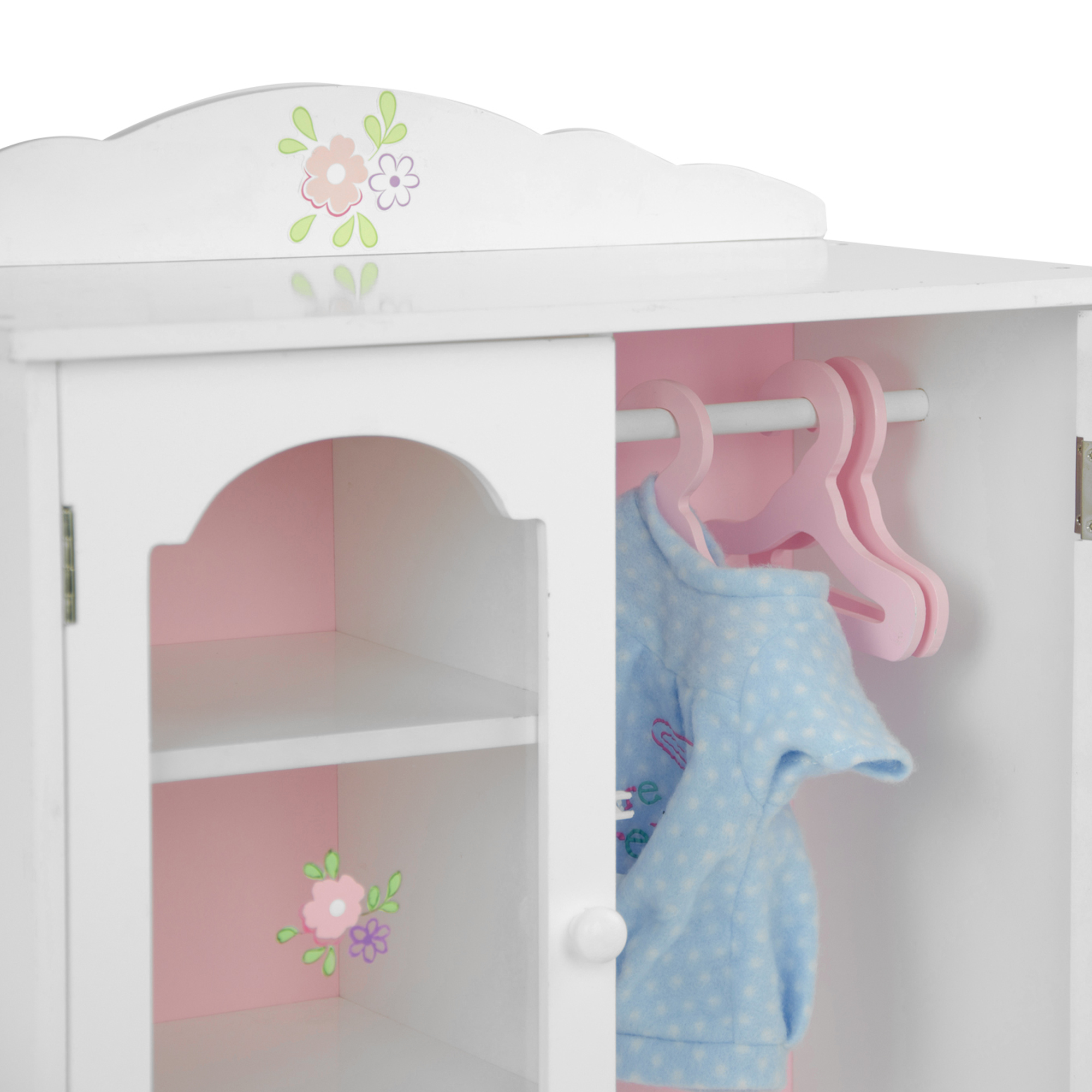 Cette magnifique armoire blanche pour poupée décorée d’un motif floral et bordée de rose à l’intérieur est le meuble en bois idéal pour ranger toutes les robes et les accessoires de soirées. Les 2 portes miroirs s’ouvrent pour offrir un grand espace de rangement avec plusieurs cintres pour ranger tous les vêtements inimaginables. (L) 42.55 cm x (l) 22.86 cm x (H) 52.71 cm.