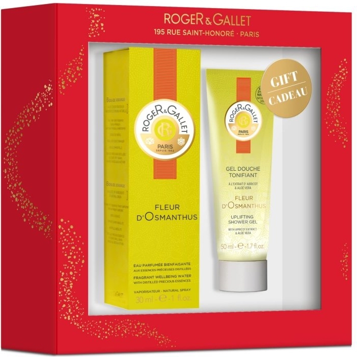 Coffret Fleur d'Osmanthus Eau parfumée Fleur d'Osmanthus 30ml + Gel douche Fleur d'Osmanthus 50ml offert Eau parfumée Fleur d'Osmanthus : Inspirée d'un jardin d'Eden de Chine, l'eau fraîche parfumée Fleur d'Osmanthus révèle une cascade de notes florales gourmandes, facettées d'agrumes et de bois. Cette brassée de fleurs d'osmanthus, fraîche et joyeuse, contenant un coeur d'huile essentielles de mandarine, de pamplemousse et de benjoin, offre au corps et à l'esprit un bien-être sensoriel euphorisant. Gel douche Fleur d'Osmanthus : La base lavante ultra-douce d'origine végétale et sans savon de ce gel douche fraîcheur vous procure une mousse onctueuse et légère qui nettoie délicatement la peau, sans la déssécher. Formulé avec de l'aloé vera aux vertus hydratantes, il apporte un confort immédiat à tous les types de peau. Sa délicieuse fragrance vous offre un moment de bien-être euphorisant.