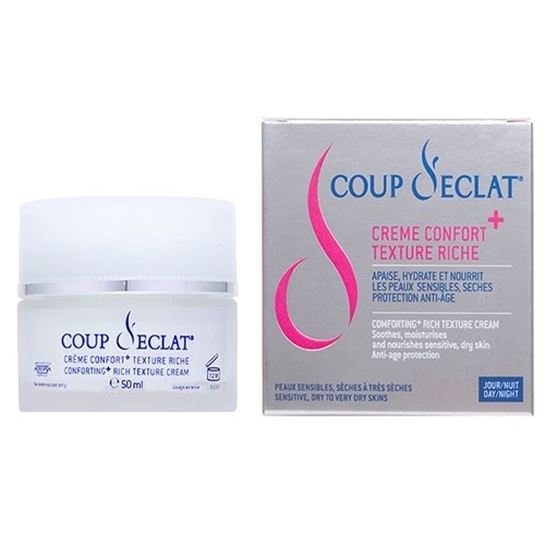 Coup d'Éclat Crème Confort+ Texture Riche 50 ml apaise, hydrate et nourrit les peaux sensibles sèches à très sèches et apporte une protection anti-âge. Très riche, ce soin bouclier protecteur enveloppe la peau de confort, calme instantanément les rougeurs et sensations d'irritations, hydrate immédiatement et protège des effets du temps et des agressions extérieures. Elle est composée d'actifs : - apaisant anti-rougeurs : melilot bio, marguerite bleue, - hydratant : complexe végétal (Imperata Cylindrica, Huile de pépins de raisins et de Caméline), - anti-âge : acide hyaluronique et algisium C. Dès la première application, la peau est apaisée (96%), hydratée (96%), les sensations d'inconfort et de tiraillement diminuent (87%). Après deux semaines, la peau est moins réactive et moins sensible (87%), visiblement revitalisée : la peau est plus ferme, plus lisse (91%).