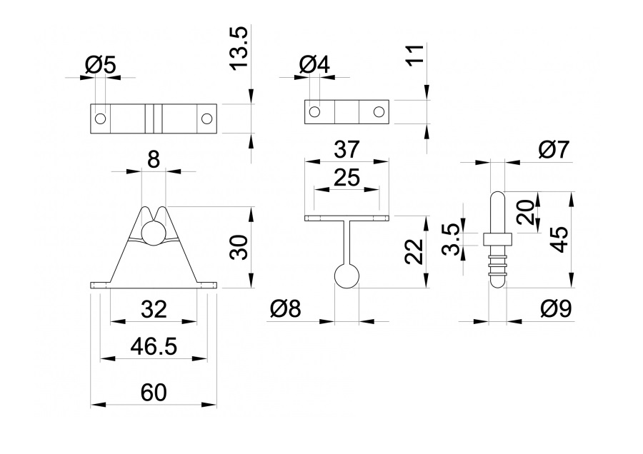 Dimensions (cm) Support: 6.0 x 3.0 cm (largeur totale x hauteur), gâche: 3.7 x 0.35 cm (largeur x épaisseur), tige: longueur 4.5 cm