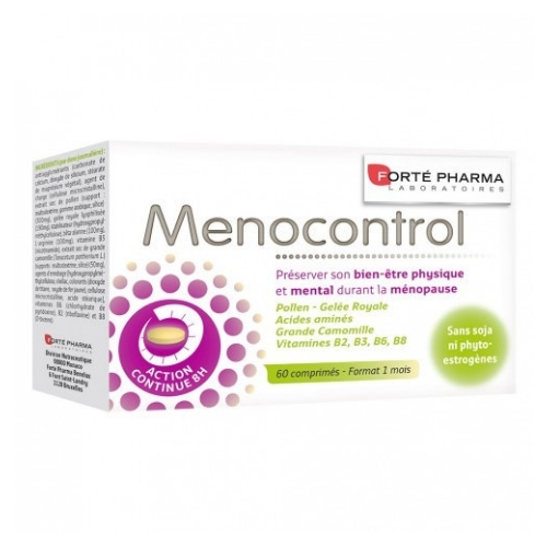 Spécialement formulé par le Département Recherche et Développement des Laboratoires Forté Pharma. Menocontrol vous accompagne pour passer plus sereinement le cap de la ménopause. L'efficacité du produit Menocontrol de Forte Pharma repose sur une formule préservant le bien-être physique et mental grâce à une association unique d’actifs : Le pollen aide à diminuer les sensations de bouffées de chaleur/sueurs nocturnes. La vitamine B6 complète cette action en contribuant à réguler l’activité hormonale. La grande camomille favorise le bien-être physique et mental ainsi que la relaxation. Des vitamines du groupe B contribuent, quant à elles, a des fonctions psychologiques normales. Des acides aminés (bêta-alanine et anginine) ainsi de la gelée royale complètent cette formule. Les comprimés à libération prolongée de Menocontrol permettent une diffusion continue des actifs durant 8h, pour une prise en charge optimale de jour comme de nuit.