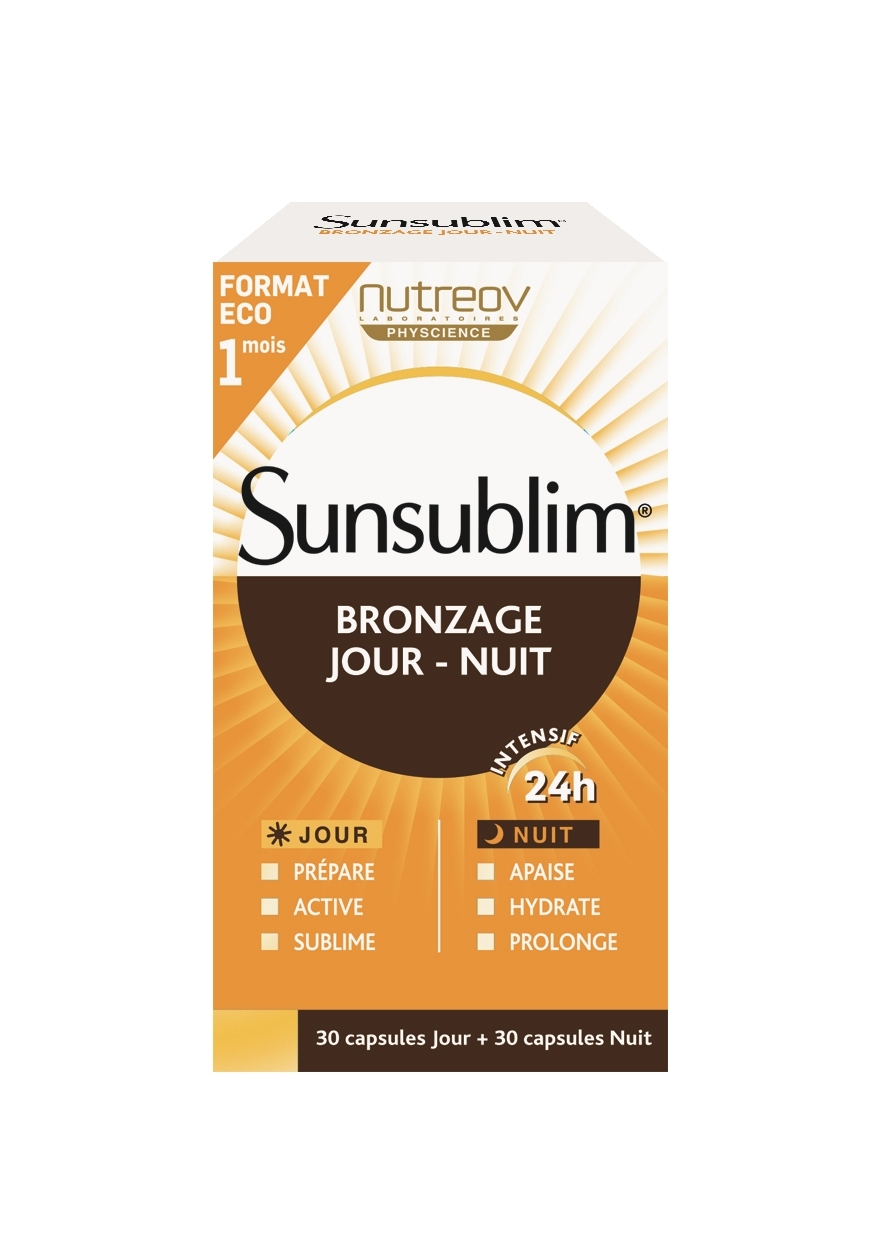 Les laboratoires Nutreov proposent Sunsublim Bronzage jour/nuit pour préparer la peau au soleil en agissant sur 24h. La formule jour prépare, active et sublime le bronzage: - elle contient de pigments d'origine végétale - avec du sélénium et de la vitamine E La formule nuit apaise, hydrate et prolonge le bronzage, elle agit en véritable soin après-soleil - avec de l'huile de carthame qui améliore l'hydratation de la peau et prévient son exfoliation de par sa composition en acides gras essentiels