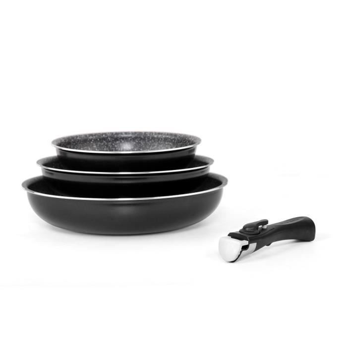 Set de 3 poeles en aluminium 20/24/28 cm de coloris noir. Revetement anti-adhérent sans perfluorooctanoique a effet de pierre. Poignée amovible et compatible tous feux dont induction.