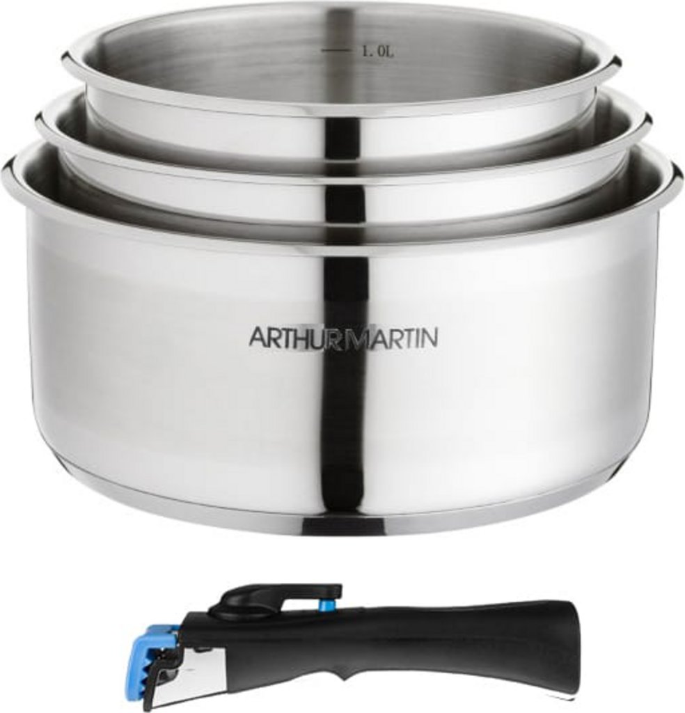 Un set de 3 casseroles signées ARTHUR MARTIN à poignée amovible, en acier inoxydable, idéal pour une cuisson saine, sans aluminium. Revêtement intérieur mat inox + extérieur inox brillant. Compatible tous feux dont induction.