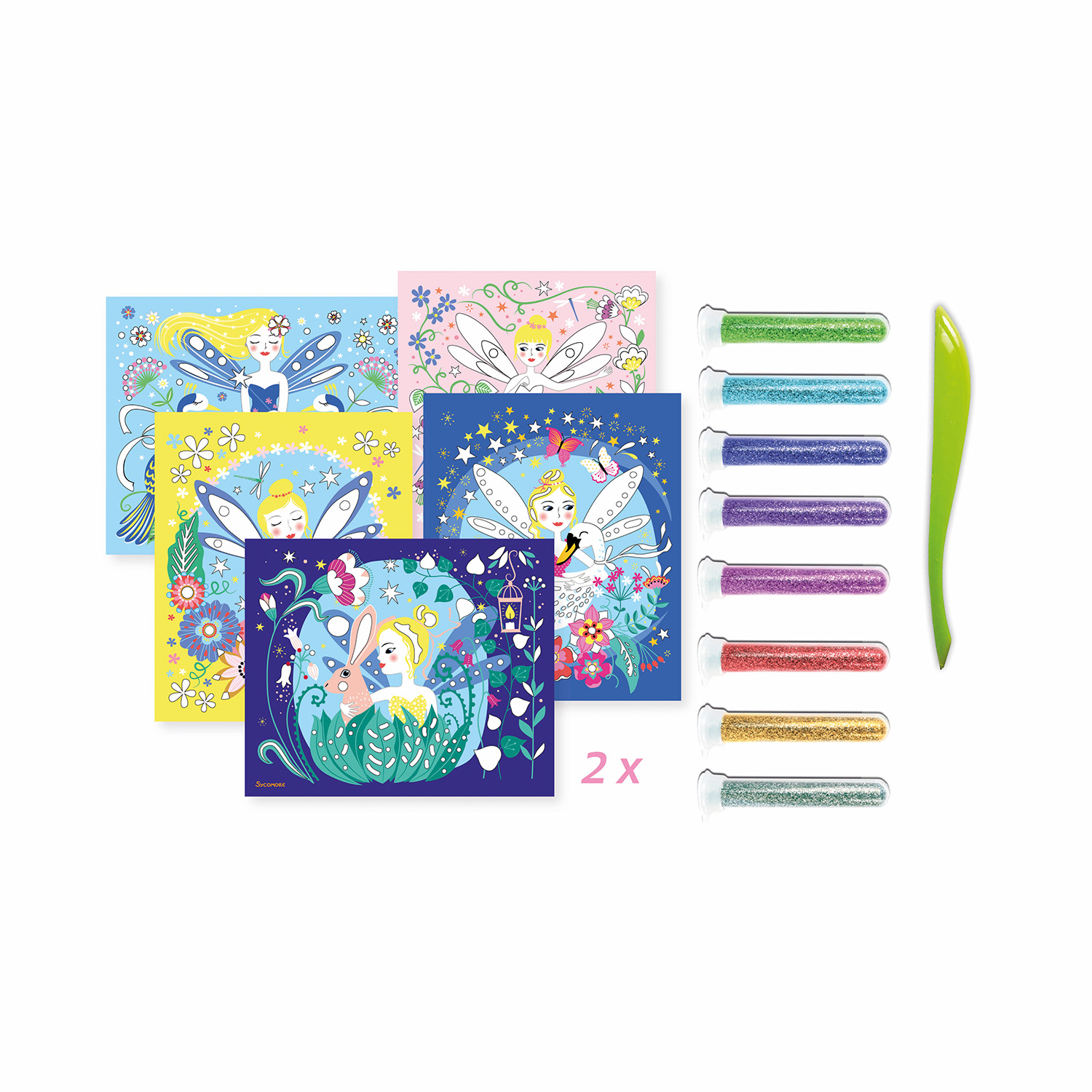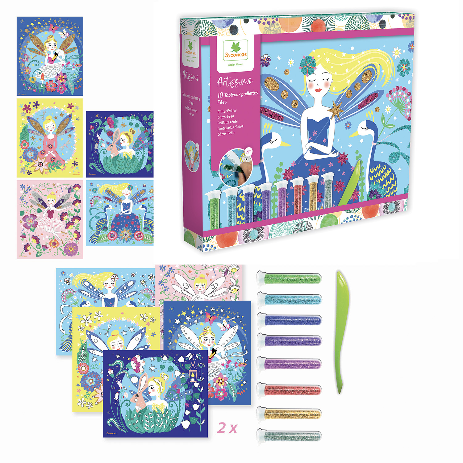 10 tableaux autocollants à décorer avec des paillettes (8 tubes) , 1 spatule et 1 livret avec modèles et instructions.