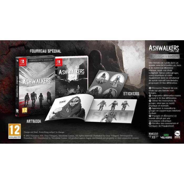 Plus-Produit : - le jeu - le fourreau spécial - l'Artbook - la planche de stickers Développé par Nameless XIII et édité par Dear Villagers, le jeu raconte le périple de quatre aventuriers devant braver les obstacles d'un univers impitoyable, et prendre des décisions difficiles qui influenceront le cours de leur histoire. Les joueurs devront notamment gérer la nourriture et l'équipement du groupe, et progresser à l'aide à un gameplay narratif dynamique pour découvrir les multiples fins du jeu. Ashwalkers - Survivor's Edition proposera un fourreau spécial, un artbook, et une planche de stickers des personnages du jeu. A la suite d'une ancienne catastrophe géologique, un groupe de survivants appelé \"La Section\" doit prendre la route dans un monde ravagé, en quête d'un refuge pour leur peuple. Mais pour parvenir à cet endroit salvateur, ils devront traverser des terres désolées et se confronter à des dilemmes moraux complexes.