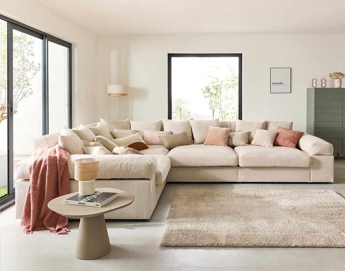 Un modèle à la pointe des dernières tendances, qui trouvera aisément sa place dans un salon aux allures contemporaines et raffinées. N’hésitez pas à associer son joli velours côtelé à des matières contrastantes, telles que le bois foncé, le lin ou le coton, le raphia, ou pourquoi pas, à un tapis berbère aux teintes vives. Vous pouvez également l’associer à une table basse gigogne arrondie aux dimensions généreuses, afin de créer un contraste des volumes du plus bel effet.