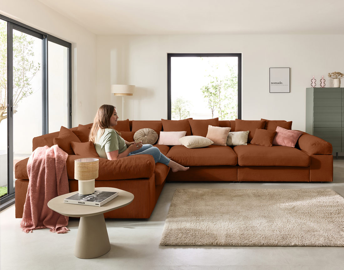 Un modèle à la pointe des dernières tendances, qui trouvera aisément sa place dans un salon aux allures contemporaines et raffinées. N’hésitez pas à associer son joli velours côtelé à des matières contrastantes, telles que le bois foncé, le lin ou le coton, le raphia, ou pourquoi pas, à un tapis berbère aux teintes vives. Vous pouvez également l’associer à une table basse gigogne arrondie aux dimensions généreuses, afin de créer un contraste des volumes du plus bel effet.