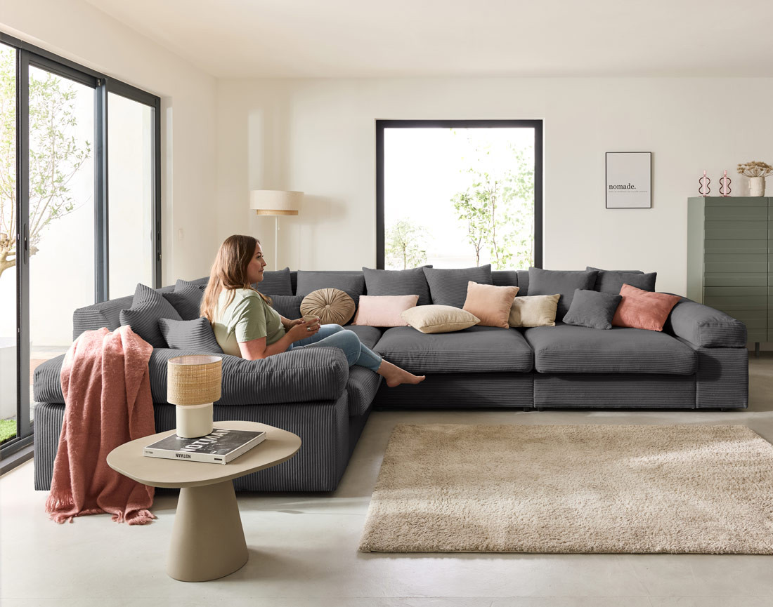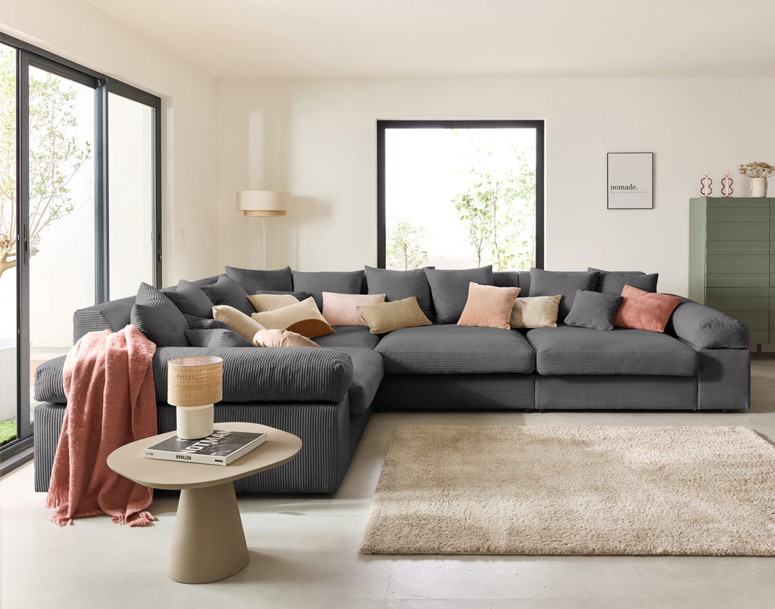 Un modèle à la pointe des dernières tendances, qui trouvera aisément sa place dans un salon aux allures contemporaines et raffinées. N’hésitez pas à associer son joli velours côtelé à des matières contrastantes, telles que le bois foncé, le lin ou le coton, le raphia, ou pourquoi pas, à un tapis berbère aux teintes vives. Vous pouvez également l’associer à une table basse gigogne arrondie aux dimensions généreuses, afin de créer un contraste des volumes du plus bel effet.
