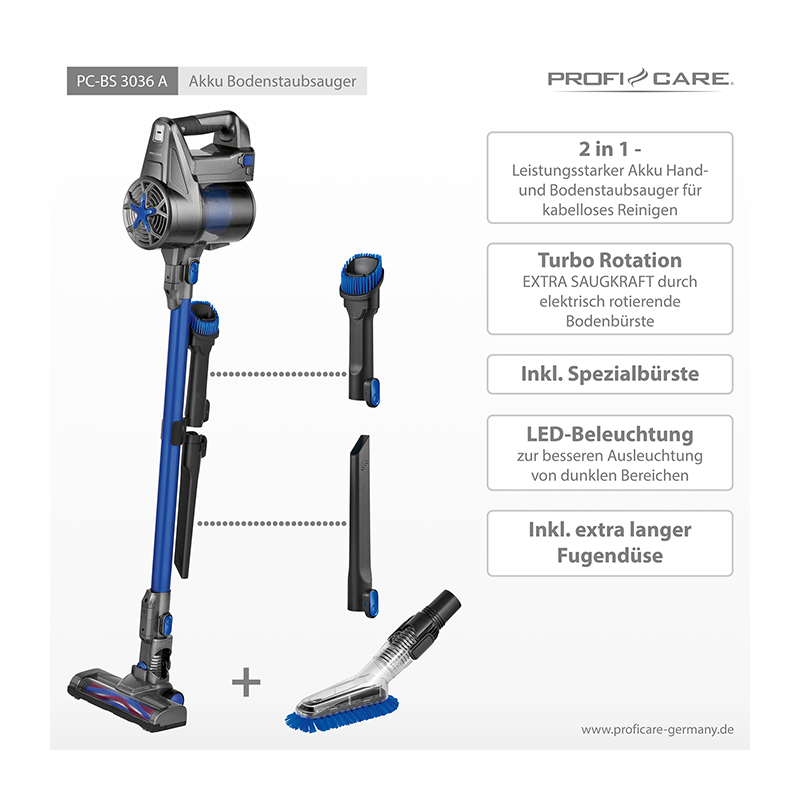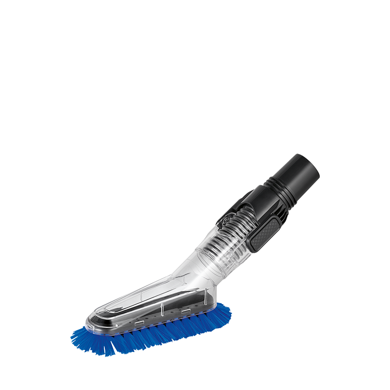 Inclus : brosse à succion extra-longue (25 cm), brosse spéciale pour coussins et textiles, brosse de sol à rotation électrique avec éclairage Led et support mural