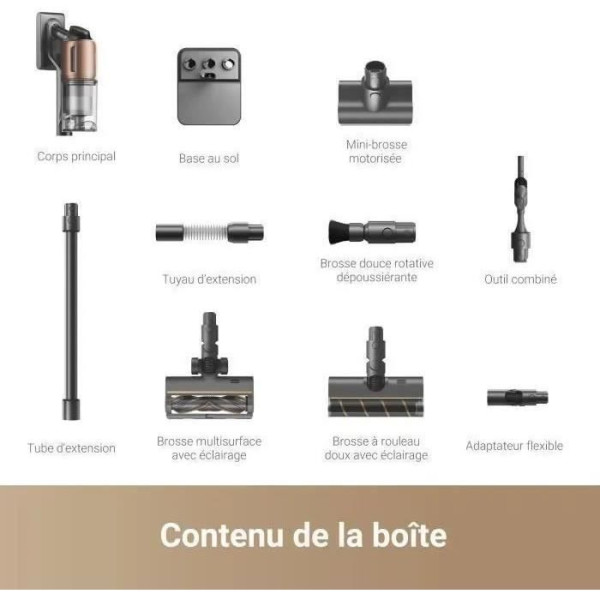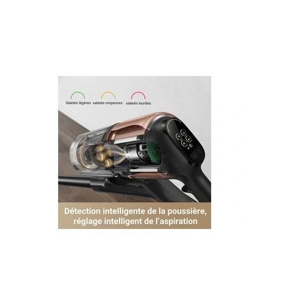 Dreame Z20, puissance d'aspiration de 250 AW, filtre HEPA (H14) de 99,99 %*, pouvant retenir des particules de 0,3 µm*. Autonomie de nettoyage sans fil de 90-min*. L'aspirateur est équipé d'un systeme de réglage et de détection intelligent, de brosses interchangeables qui permettent de révéler les poussieres invisibles et d'accessoires divers pour gérer efficacement différentes tâches de nettoyage.