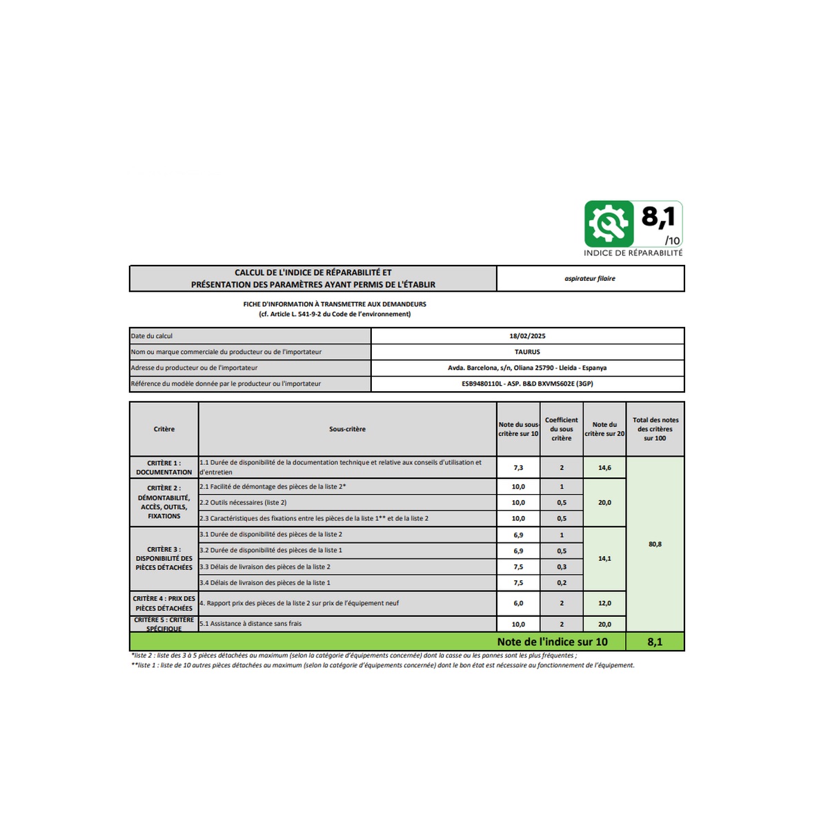 Indice de réparabilité 8,6 / 10