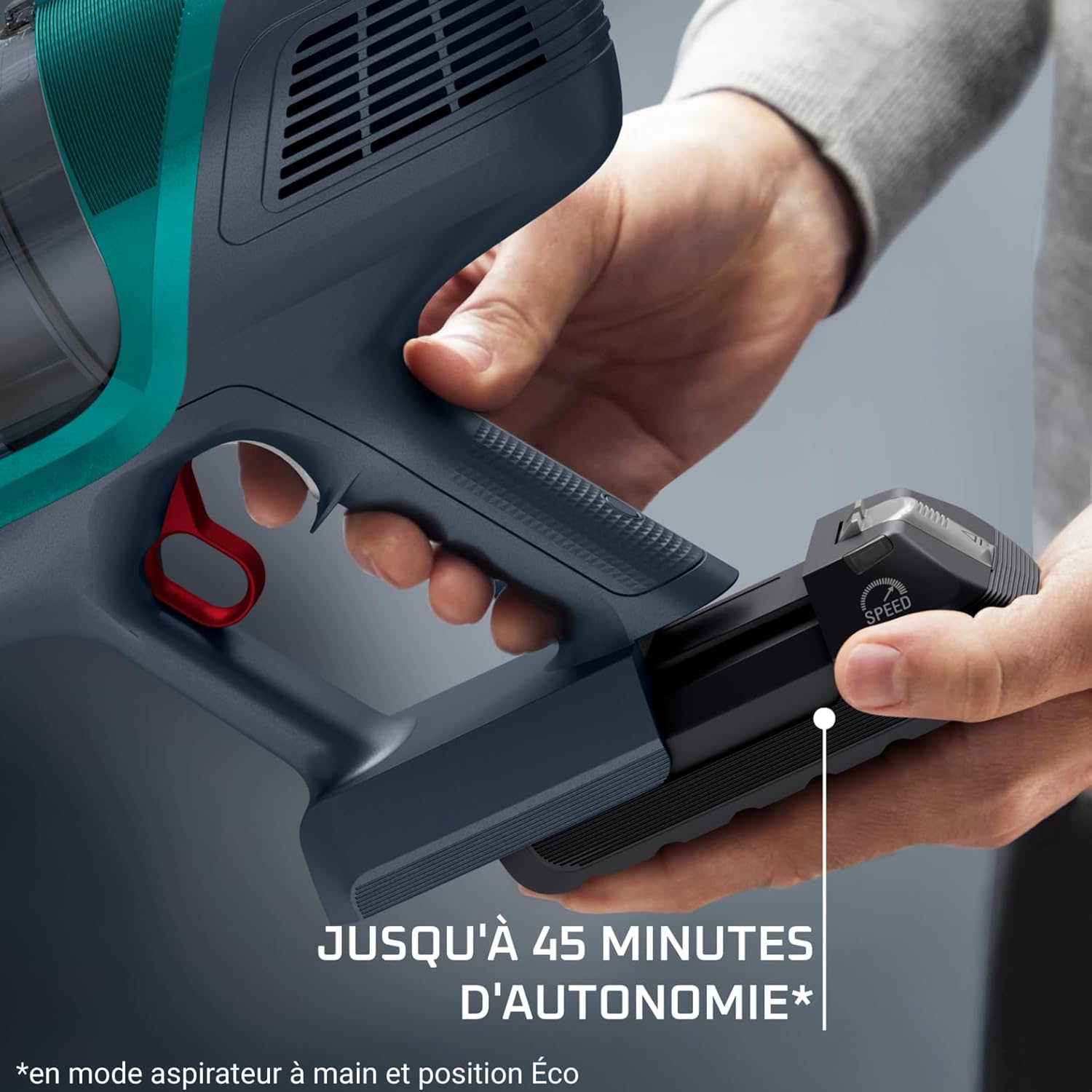 La batterie de 18V vous garantit une aspiration puissante et constante jusqu'à 45 minutes*. Comme elle est amovible, elle peut être chargée dans n'importe quelle prise de courant, aussi facilement qu'un téléphone portable, pour une liberté totale !