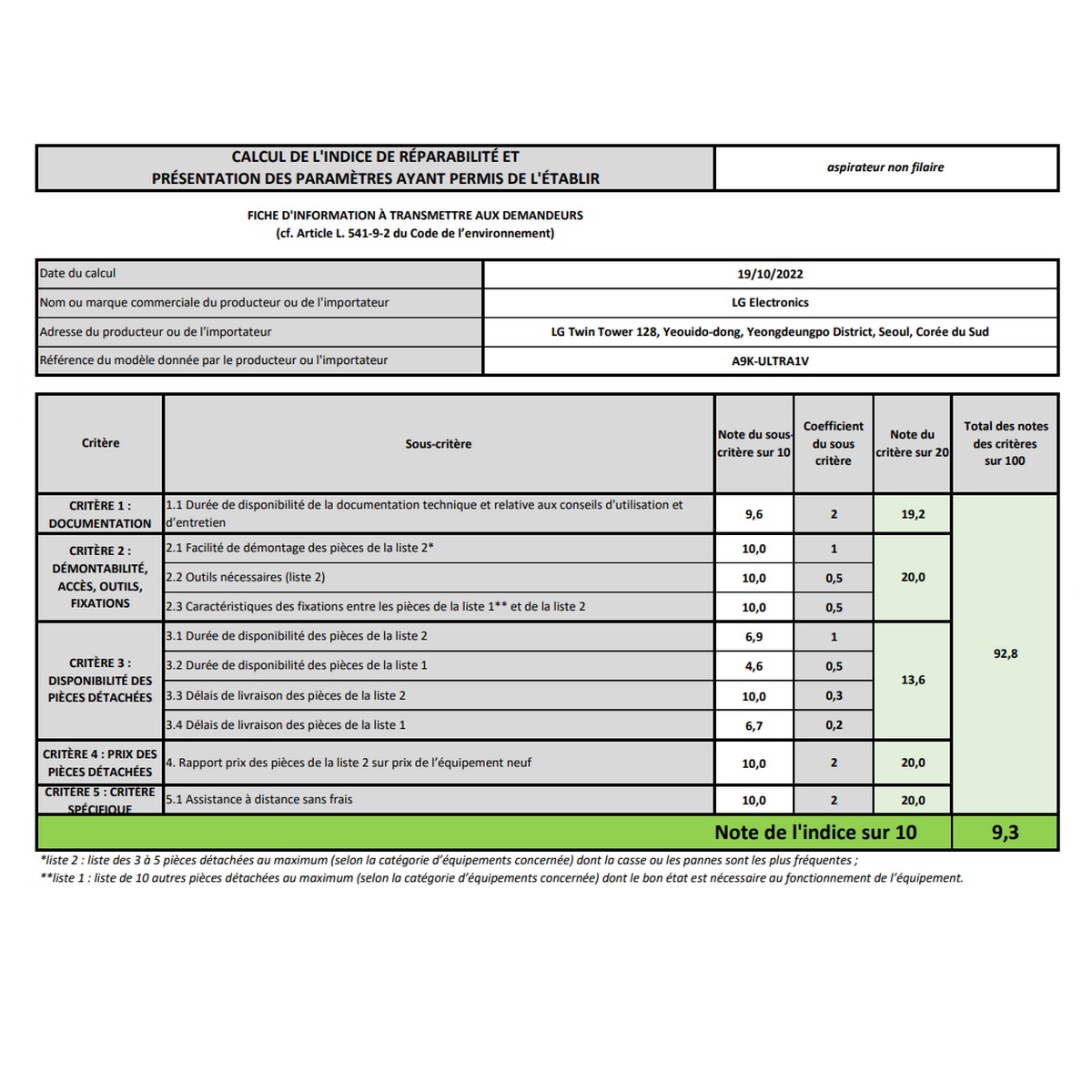 Indice de réparabilité (Note /10) : 9.3.