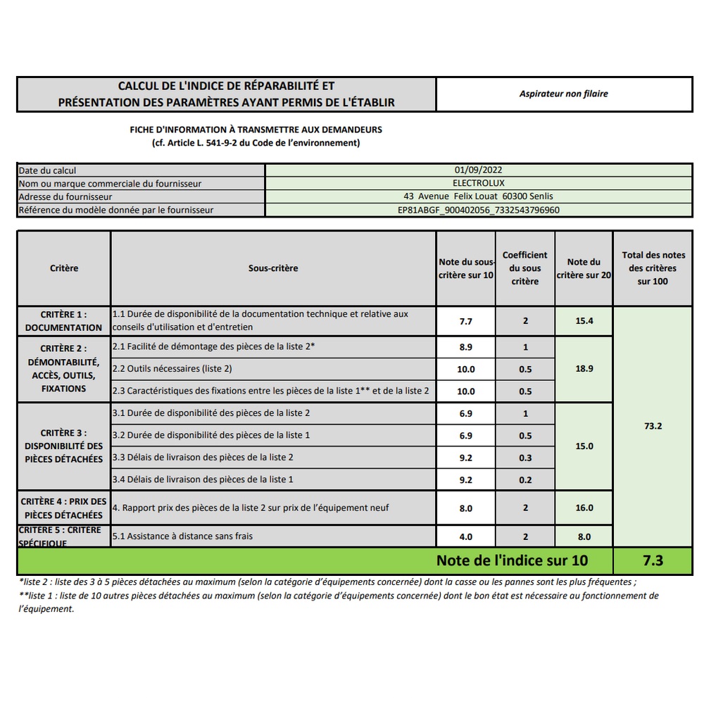 Indice de réparabilité 7,3 / 10