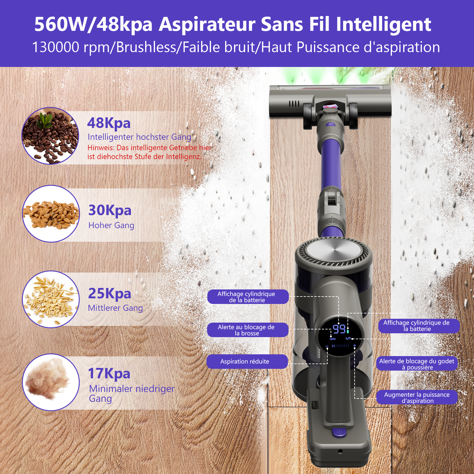 Aspirateur Balai sans Fil Puissant 560W/48Kpa OLED Ecran Tactile Jusqu'à 65Mins Aspirateur Pliable à 180°