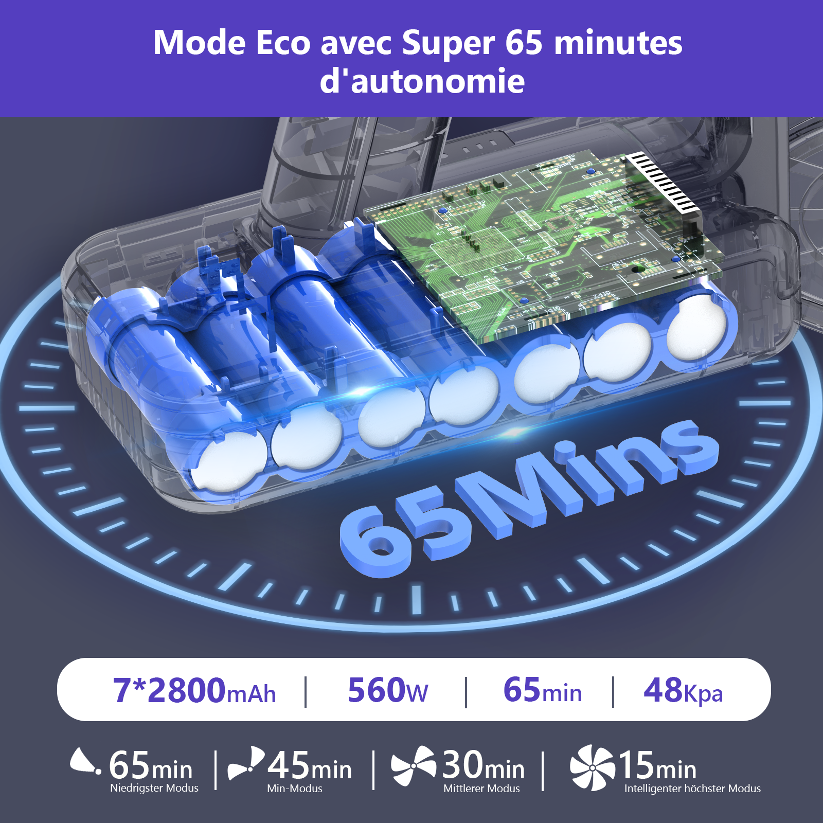 ![]() | 65 Mins d’utilisation Le puissant aspirateur balai sans fil est doté d’une batterie Li-Ion intégrée de 7*2800 mAh qui peut fonctionner jusqu’à 65 minutes en mode automatique. 4 modes d’aspiration : Auto (17 kPa ≈ 65 minutes), Eco (25 kPa ≈ 45 minutes), Standard (30 kPa ≈ 30 minutes) et Maximum (48 kPa ≈ 15 minutes). Il lui faut moins de 4,5 heures pour se recharger complètement et nettoyer toute la maison en toute simplicité. |