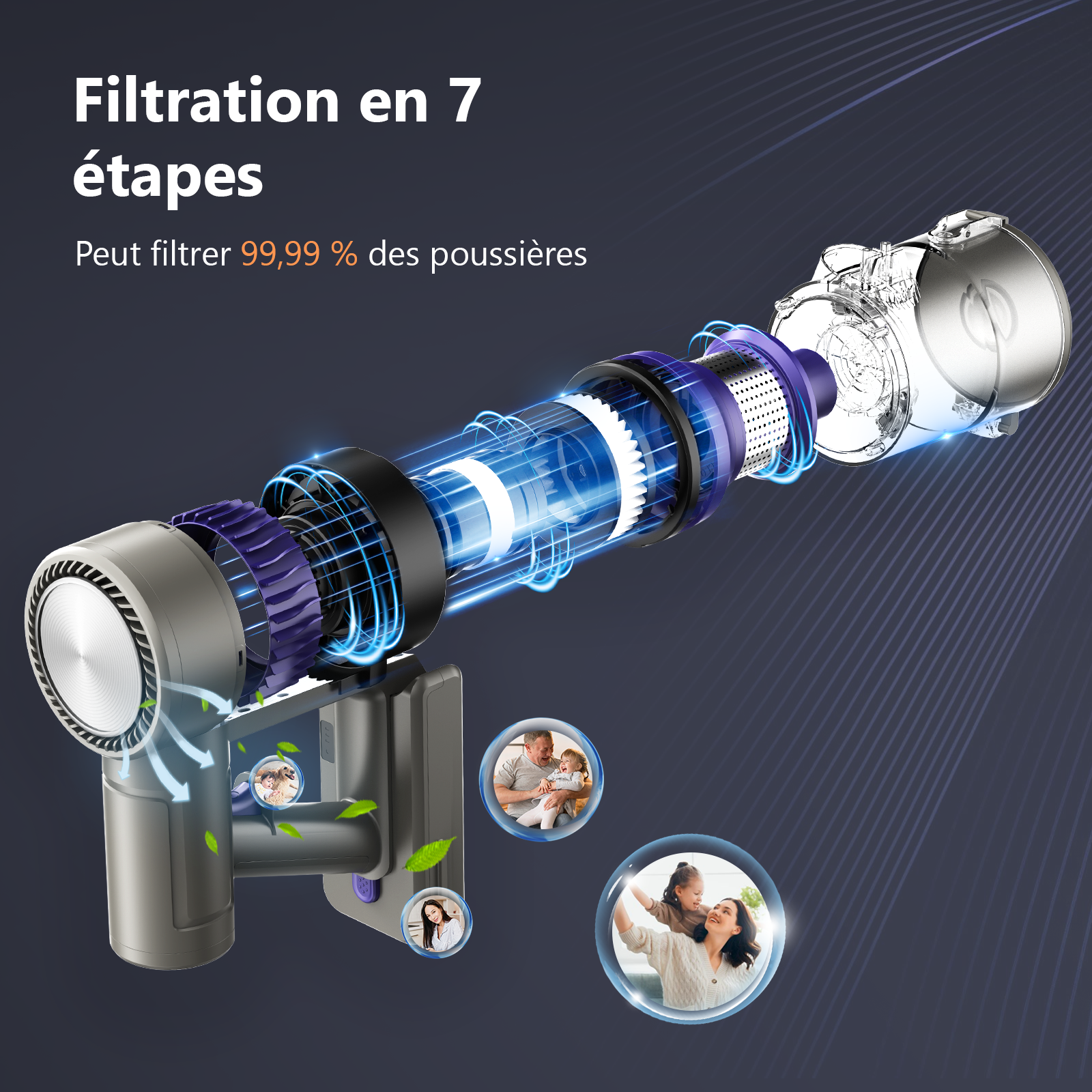 | Système de filtration à 7 étapes La performance d’aspiration est optimale grâce à la technologie de filtration à 9 niveaux, qui permet de bloquer 99.99% des particules fines à 0,1um et des allergènes. Éviter la pollution secondaire de l’air, adapté aux personnes sensibles. | ![]() |
