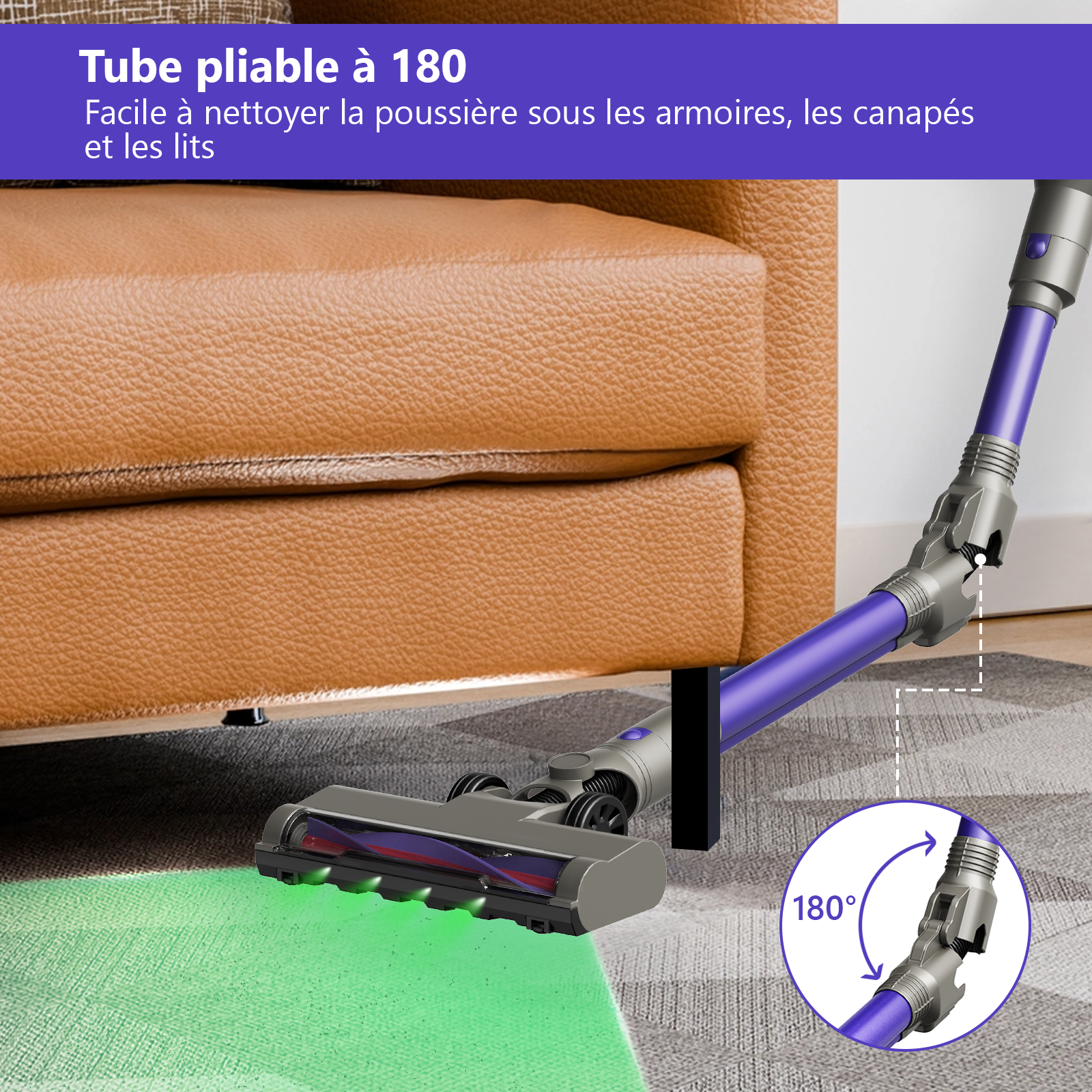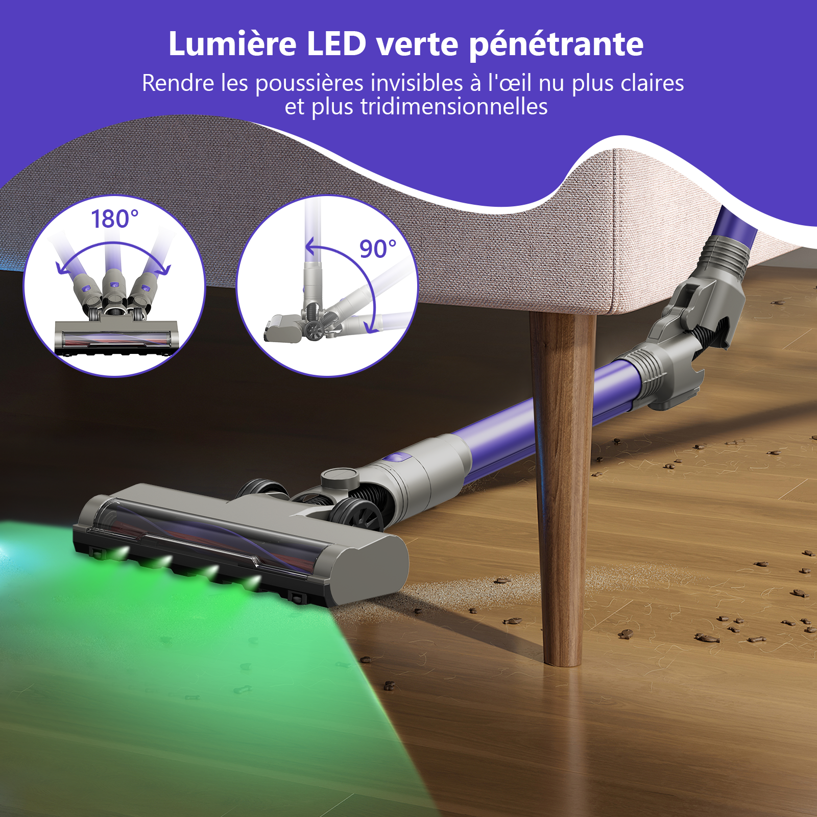 ![]() | Tuyau Pliable à 180° Équipé d’un tuyau flexible pliable, vous pouvez facilement nettoyer le fond du lit, du canapé et d’autres coins sans vous pencher, réduisant ainsi la charge sur votre taille. La lumière LED verte a un fort pouvoir de pénétration et brille sur le sol. La poussière est clairement visible et est rapidement aspirée dans la boîte de collecte de poussière par le moteur à grande vitesse, nettoyant le sol instantanément. |