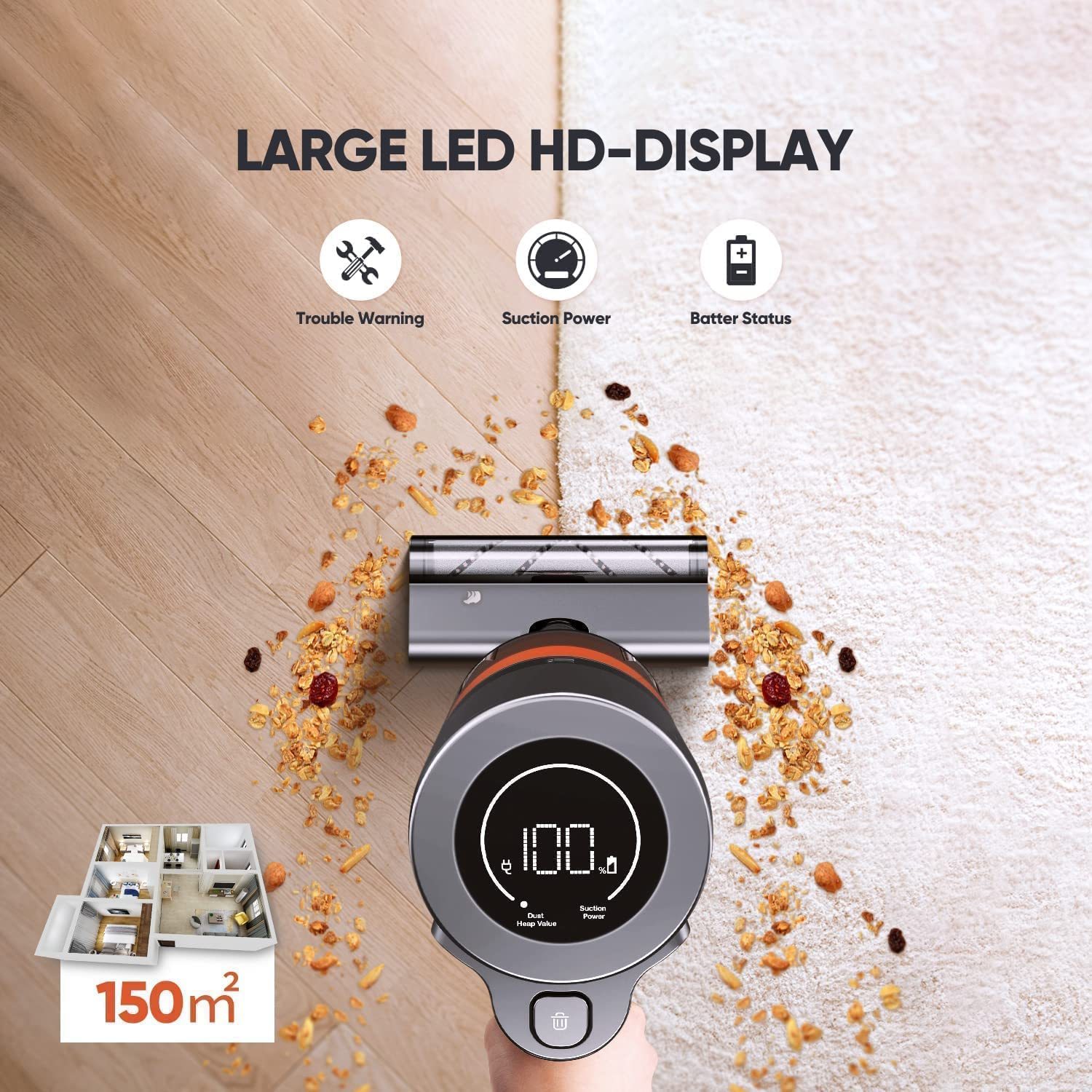 7 batteries au lithium 2500 mAh. En mode éco, l'aspirateur à batterie peut nettoyer une zone de 150 mètres carrés. Le design détachable rend la charge de la batterie plus pratique. Un écran LED intelligent peut afficher la puissance résiduelle et la puissance d'aspiration en temps réel, vous permettant de mieux saisir le rythme de nettoyage et d'éviter l'anxiété de la batterie faible.