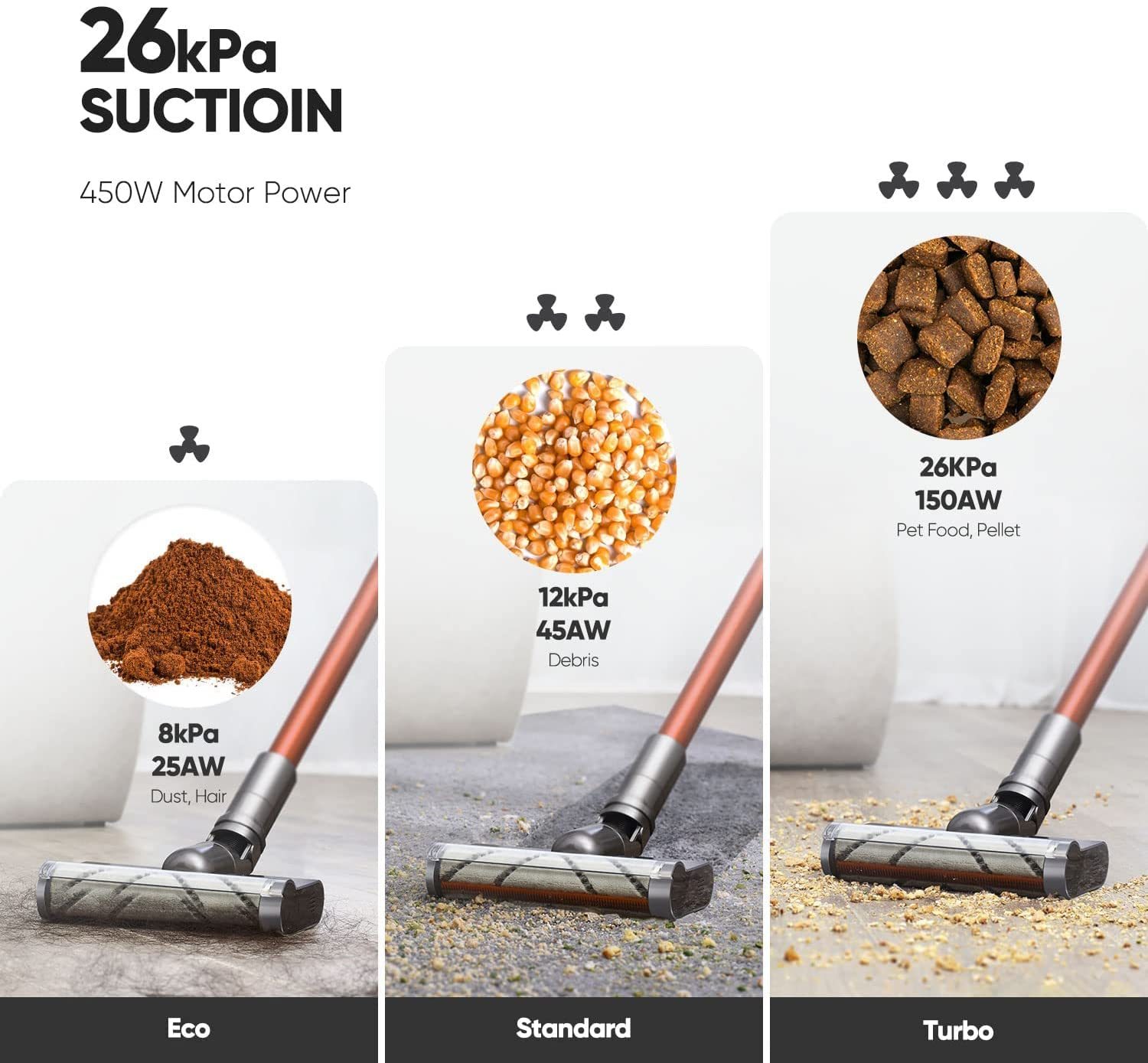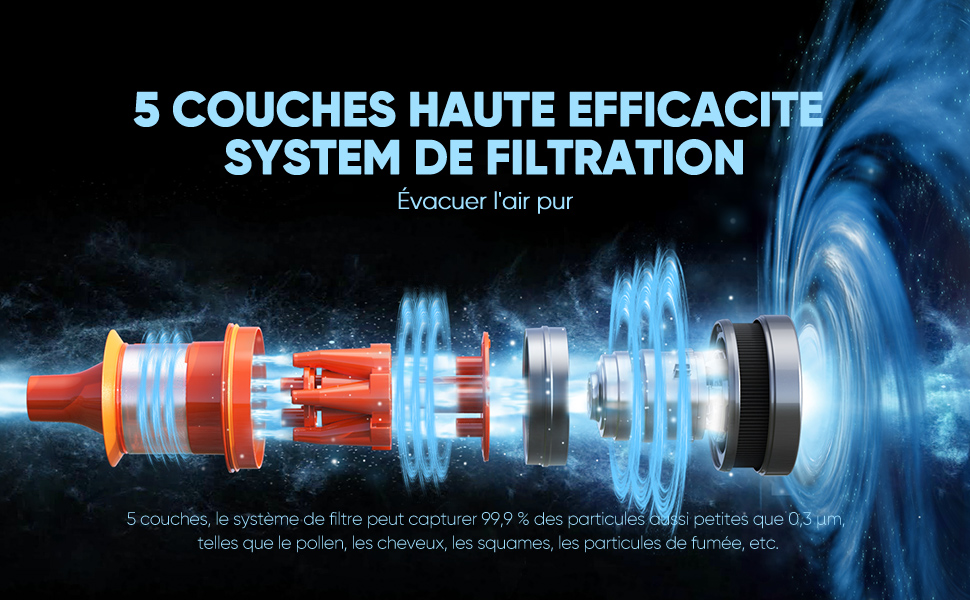 [Système multi-cône à 5 couches et filtration jusqu'à 99,9 % ] Système multi-icône synergique à deux étapes, l'effet de séparation de la poussière et du gaz est amélioré, pas de perte d'aspiration, évacuation de l'air propre. L'efficacité de filtration peut atteindre plus de 99,9 %, jusqu'à 0,3 microns de poussière. Le design de la prise d'air de l'aspirateur sans fil empêche la vidange de souffler directement sur votre visage, vous offrant une expérience de nettoyage confortable.