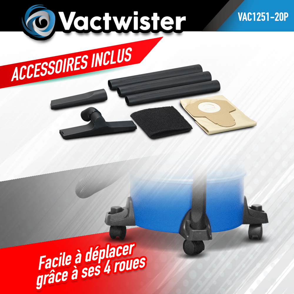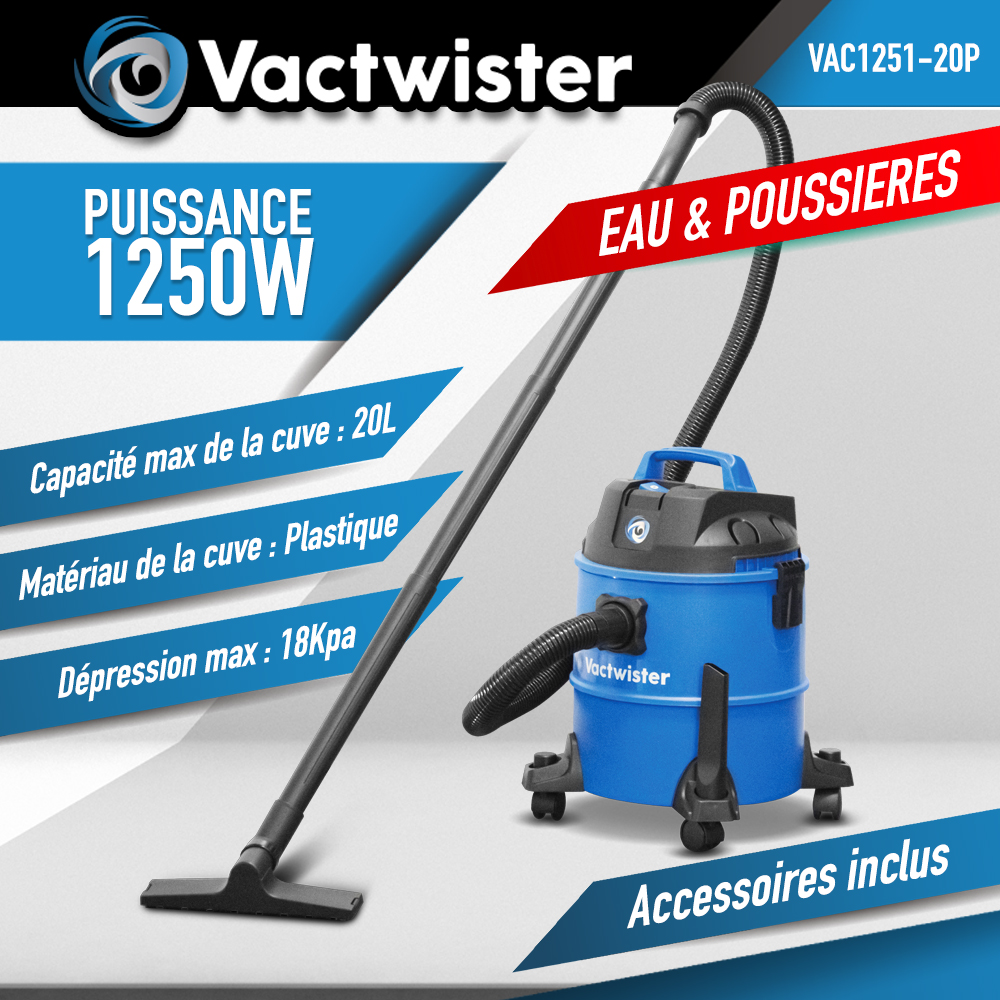Aspirateur eau et poussières 1250W - 20L plastique - 18 Kpa avec soufflerie - Vactwister