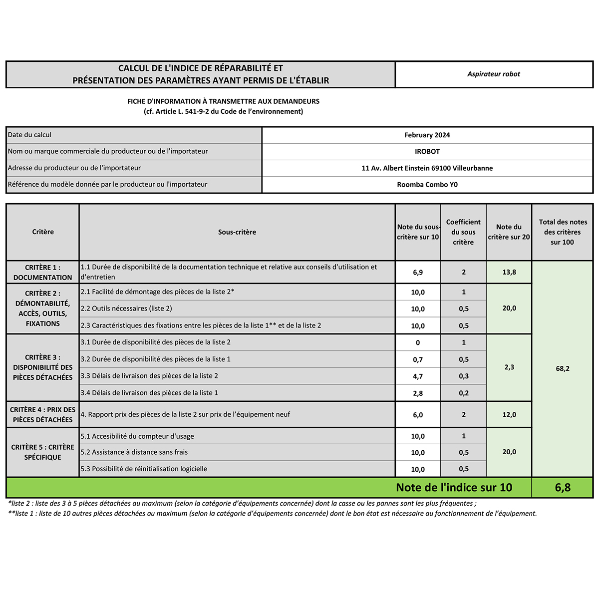 Indice de réparabilité 6,8 / 10